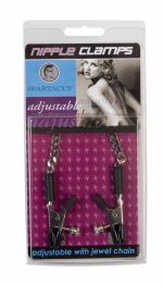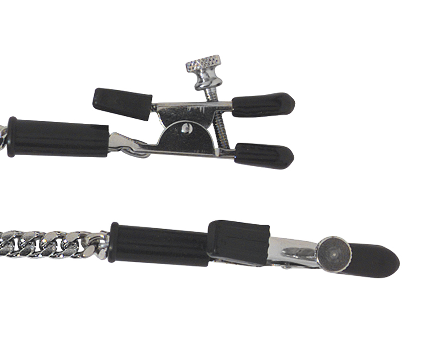 Spartacus gator nipple clamps deliver a tantalizing pinch that you will definitely notice. The skinny tips deliver localized pressure as lightly or as tightly as you choose. Alligator Nipple Clamps with wide alligator ends and a jewel chain are great for large nipples that need a wider than usual tip. The wide, rubber-tipped tips distribute the pressure from the clamp, making them good for somewhat gentler play. But don’t be fooled the thumbscrews can adjust the clamps to a very strong grip. Nipple clamps and jewel chain provide a classic fetish look. Non-piercing nipple clamps with broad ends tipped in black rubber for comfort. Spartacus A Passion for Quality Catalog page 6. New images added February 10, 2013. -old