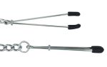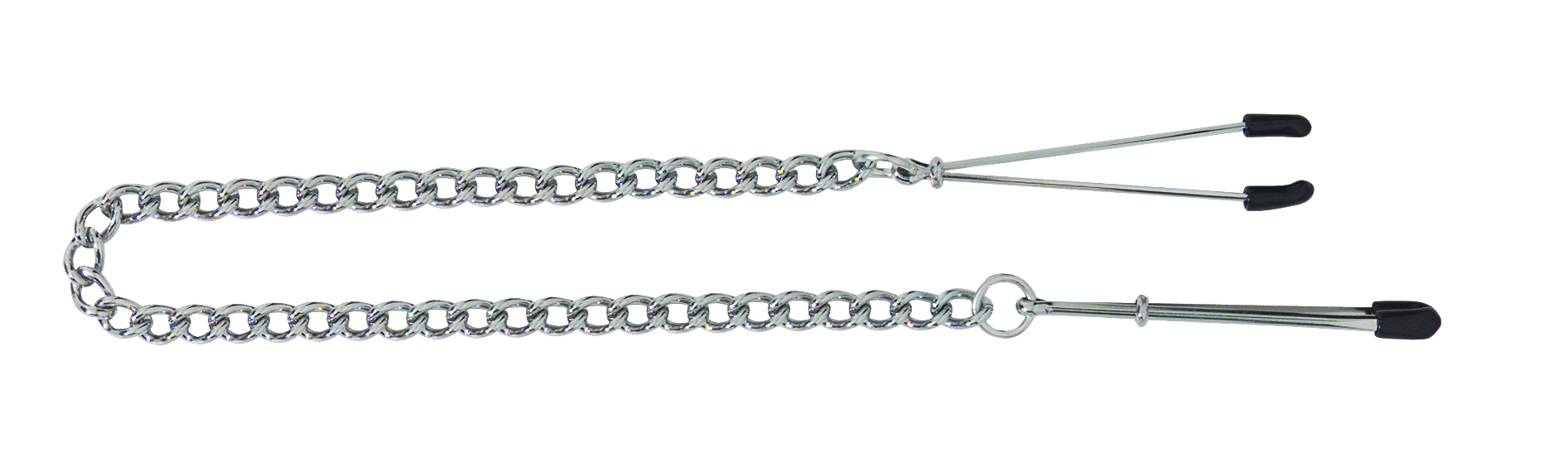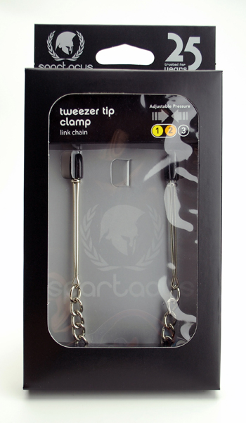 Excellent for beginners and experienced alike, gorgeous Spartacus Tweezer clamps offer a look that is sensually attractive on both women and men. Tweezer clamps adjust at the touch of a finger for a satisfying range of sensations, from delicate pinch to moderate pain. These adjustable tweezer-style clamps are a great choice for beginners because they’re adjustable. Simply center the nipple between the rubber tips and slide the ring up to the desired tightness. The jewel link connector chain keeps the wearer’s sensual focus on the nipples with each movement. When more intense play is desired, the rubber tips can also be removed to reveal tiny teeth that add an erotic bite to kinky play. A fun toy to enjoy throughout your BDSM experiences. Color: Silver Type: Nipple Clamps Style: Tweezer. Material: Metal Nipple Clamps, Rubber Ends. Special Features: Connecting Chain, Adjustable. Spartacus A Passion for Quality Catalog.