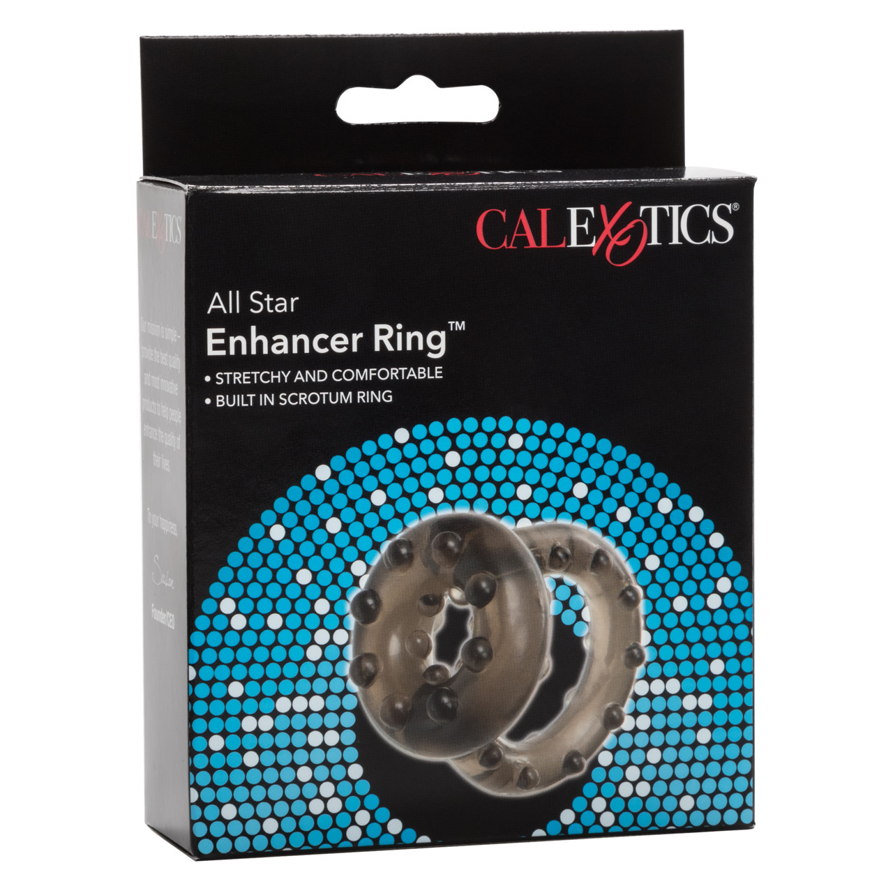 All Star Enhancer Ring from California Exotic Novelties. Designed for total comfort and orgasmic ecstasy, the All Star Enhancer Ring is perfect for thefirst time and experienced users. The textured pleasure noduled ring provides ultimate stamina support for a rock hard erection and peak performance. Use the erotic enhancer for intimate couples play seduction, or for sensuous solo fun. The comfort fit enhancer is made from pliable, flexible, super stretchy phthalate free Thermoplastic Elastomers TPE. Ring measures a compact and discreet 2 inches by 1.75 inches. The stimulating erection keeper offers sturdy support, and easily slips over the erect penis and wraps around the scrotum, for maximum assistance. The Ring is studded with tantalizing pleasure nubs that arouse, tease and please. For increased enjoyment and orgasmic explosions, always use a quality water based personal lubricant with this sex toy. The erection Enhancer is easy to use and comfortable to wear, and great for extended intimacy whenever you are in the mood. The durable textured Enhancer can be used alongside your favorite vibrating toys and offers heightened sensitivity with ultimate pleasure control. Use your imagination, and take full charge of your sensual satisfaction with the supportive enhancer ring. Explore your secret and wild desires with full and unlimited support. Before and after use, remember to clean the studded ring with a toy cleaner spray, or wash it in warm soapy water. Rinse with warm water. Pat dry before storing. Lovemaking essential! All Star Enhancer Ring is a pliable and super stretchy Enhancer Ring is designed for comfort and sturdy support. Safe and pure for body and pleasure. Made using phthalate free, non-toxic materials: Thermoplastic Elastomer TPE Enhancer Ring. Ring measures 2 inches long by 1.75 inches wide. Bulk weight 0.6 ounce. Cock rings when worn around the base of the penis and testicles, many users find that cock rings increase sexual pleasure. Do not wear a cock ring for more than 30 minutes. Cock rings give you a longer lasting erection by trapping the blood supply in the penis and intensify orgasms. Cock rings are ideal for men with premature ejaculation or erectile dysfunction. There are no guaranteed results from cock ring usage. Prolong rings, erection enhancement, climax control rings, cock rings. All Star Enhancer Ring is a registered trademark for California Exotic Novelties. Sex toys and sexual wellness. Categories: Bondage, Fetish, Kink, Sex Toys for Couples, Men, Women, Love Rings, Cock Rings, Couples Cock Rings, Men’s Cock and Ball Gear. 2023.