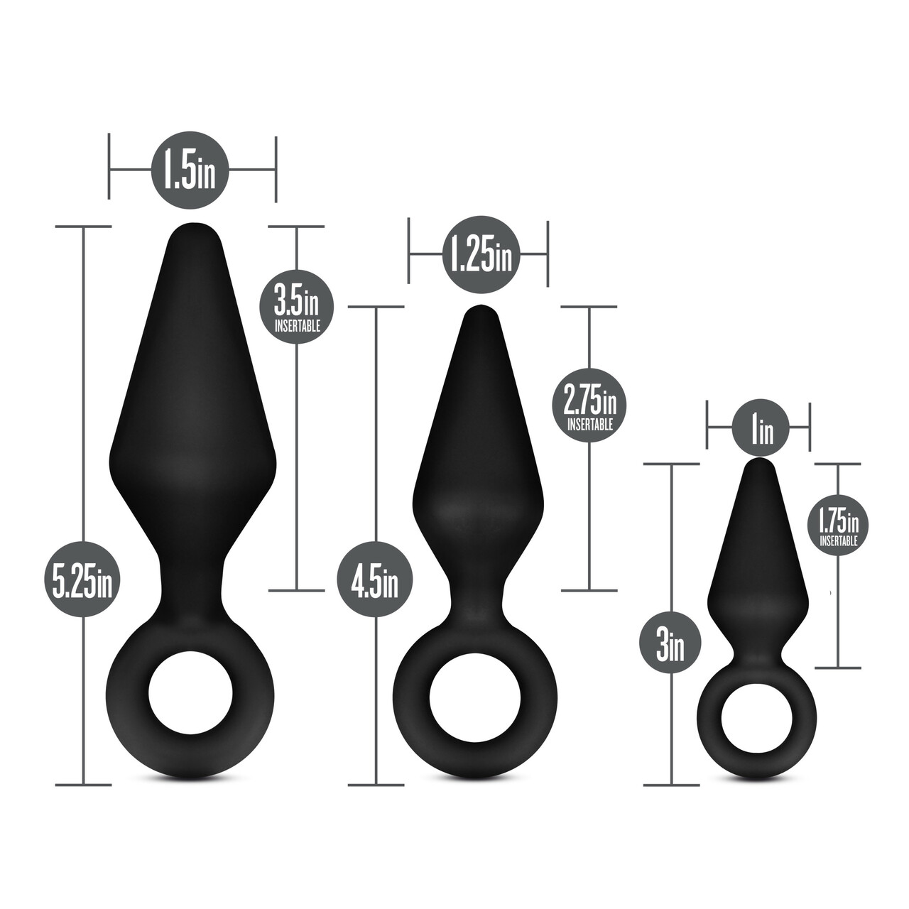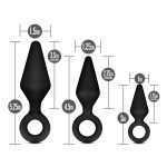 Anal Adventures Platinum Silicone Loop Plug Kit Black from Blush Novelties. For anyone looking to explore new anal sensations alone or with a partner! Anal Adventures provides many options to choose from. This kit has 3 tapered plug sizes to move up from small to large and achieve a comfortable stretch! All feature a sturdy firm ring at the base for safety and easy removal. The Ultra Silk Silicone, with its silky smooth feel, warms with your body heat. Explore. Perfect for adding new sensations. Size up. 3 sizes for safe anal stretching. Easy. Tapered shape and Loop base for easy removal. Peace of mind. Made from Ultra Silk Silicone and body safe ABS Plastic. Contains no phthalates, or Latex. Sizes Small plug 3 inches, Medium plug 4.5 inches and Large plug 5.25 inches. Insertable length inches 1.75 inches, 2.75 inches, 3.5 inches. Width 1 inch,1.25 inches, 1.5 inches. Circumference 3 inches, 4 inches, 4.75 inches. 1 year warranty. Blush Novelties – Anal Adventures. Categories: Anal Toys, Sextoys for Couples, Sensual Kits, Anal Trainer Kits. Restricted, Amazon Restricted. 2024.