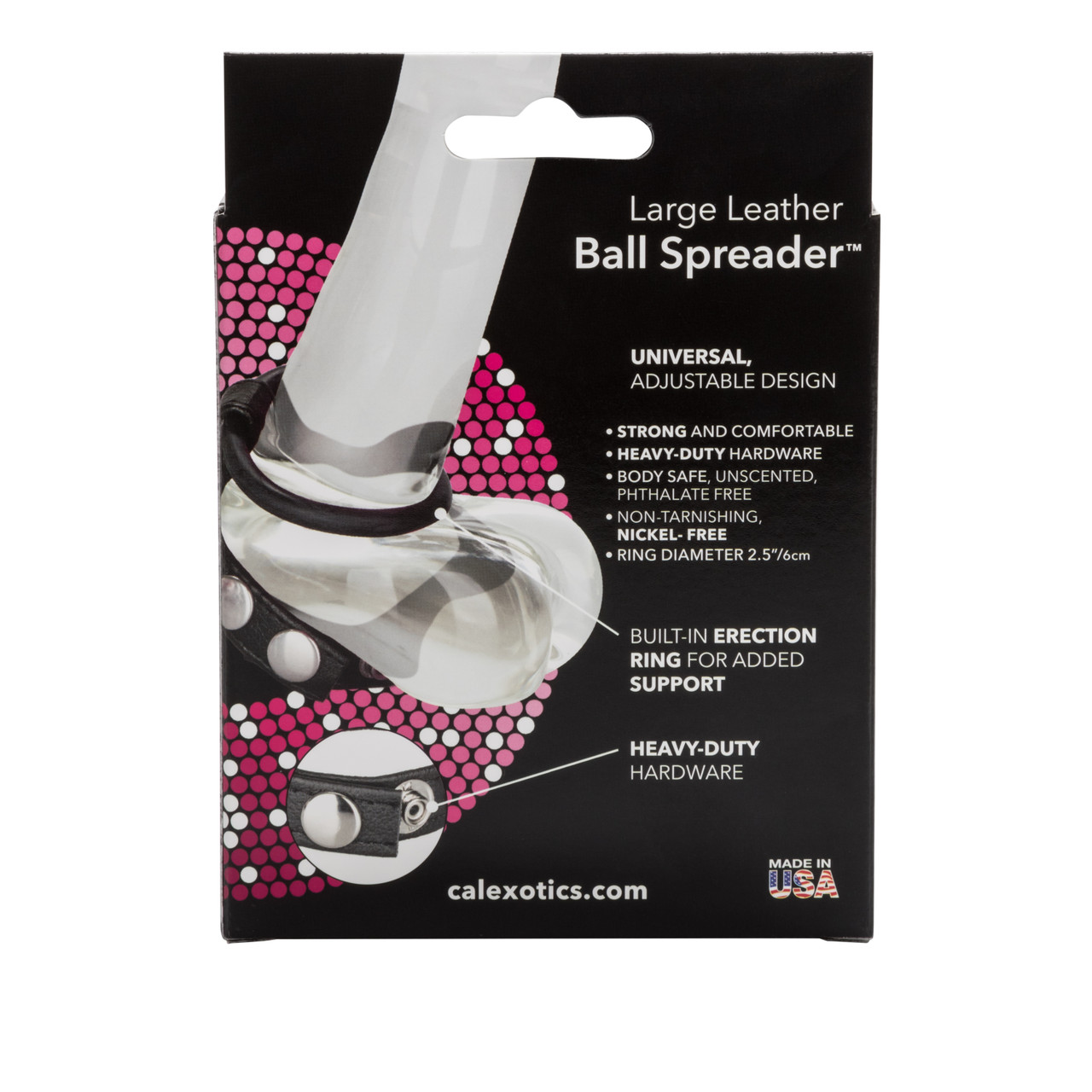 Ball Spreader Large Leather from California Exotic Novelties. Engage in extended seduction and intensified pleasure, with the easy to use Ball Spreader. The fully adjustable Strap and Ring combo erection enhancer comfortably fits over the Erect Penis and Scrotum for longer lasting performance, and heightened orgasmic pleasure. Slip on the strap and adjust the push snaps to accommodate your comfort and personal size. Your intimate erotic experiences will be super sized every time. The Enhancer comprises of a soft genuine Leather Strap, with easy adjustment Steel Plated Snaps and a flexible, smooth Rubber Ring. The Enhancer is ideal for spontaneous sensual exploration wherever you go. The Leather Strap is designed to fit around the base of the Scrotum, and is easily adjusted for the perfect support and tantalizing tension. The Rubber Ring slides over the Penis to maintain personal performance and stamina. For maximum mind blowing pleasure, always use a quality water based personal lubricant with this sex toy. Ideal for first time and experienced users, the Enhancer can be used for solo intimate fun, and sensuous stimulation during couples play. Use the Strap to elevate your seduction, and to extend ecstasy pleasure. The Rubber Ring offers ultimate erection support so that you can stay rock hard for longer periods of time. Before and after every use, clean the Erection Keeper with a toy cleaner spray. Rinse with warm water. Pat dry before storing. Rock hard fun! Ball Spreader Medium is an adjustable erection strap and ring combination that provides for prolonged Erection and more enjoyable lovemaking. The Leather Strap with three silver toned snaps allows quick and easy adjustments. The Rubber Cock Ring is designed to maintain the ultimate erection. Do not wear a Cock Ring for more than 30 minutes. Cock Rings give you a longer lasting erection by trapping the blood supply in the Penis and intensify orgasms. Cock rings are ideal for men with premature ejaculation or erectile dysfunction. There are no guaranteed results from Cock Ring usage. Cock Ring is approximately 1.75 inches. Bulk weight 0.5 ounce. Adjustable Strap with Ring. Safe and pure for body and pleasure. Made using phthalate free, non-toxic materials: Leather Strap, Rubber Ring, Steel with Plating Snaps. Pursuant to 18 U.S.C. 2257, Ball Spreader was produced on April 1, 1996, and the records required to be kept by that law are available at 14235 Ramona Avenue, Chino, California 91710. Custodian of Records: Susan Colvin. Ball Spreader is a registered trademark for California Exotic Novelties. Sex toys and sexual wellness. Categories: Bondage, Fetish, Kink, Love Rings, Cock Rings, Men’s Fetish Wear, Adjustable, Versatile Cock Rings, Men’s Cock and Ball Gear. 2023.