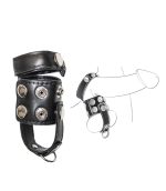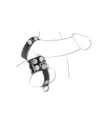 Ballgear Ball Stretcher with Separator and D-Ring Black from Nasstoys of New York. Ballgear Ball Stretcher with Separator and D-Ring features vegan faux leather and durable, adjustable metal snaps to create a comfortable fit while enhancing sensitivity and assisting in providing a firmer erection. To use, secure one ring around the base of the penis and the other between the testicles and the penis; then place the third strap between the testicles and snap into place. A leash, weights, or any other fun penis accessory may be attached to the D-ring located on the underside of the testicle separating strap. Enhances hardness and sensitivity. Adjustable stamina strap. Phthalates free materials Metal and Faux Leather Polyurethane PU, Metal Snaps. Size length 5.5 inches, width 1.75 inches. Categories: Bondage, Fetish and Kink, Men’s Fetish Wear, Adjustable and Versatile Cock Rings, Men’s Cock & Ball Gear. Nasstoys – Ballgear. Restricted, Amazon Restricted. 2023.