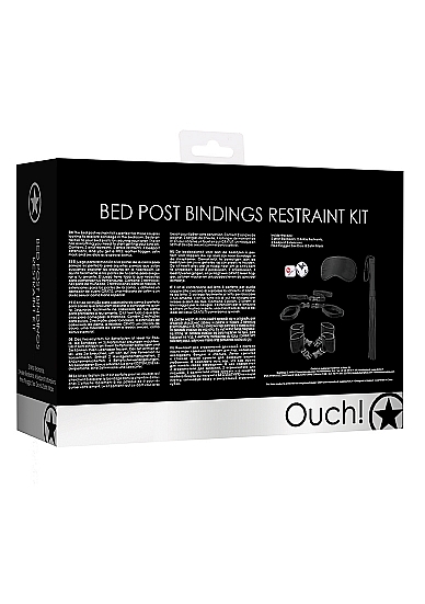 Ouch! Bed Post Bindings Restraint Kit Black from Shots Toys. The Bed post restraint kit is perfect for those couples looking to explore bondage in the bedroom. Easily attaches to your bed posts for securing your lover. The kit has everything you need to start getting your kink on. Contains 2 wrist restraints, 2 ankle restraints, 4 bedpost extensions, and you get a free leather flogger, satin mask and sex dice as a special bonus. Dimensions package 6.69 inches by 9.61 inches by 3.15 inches Weight package 15.87 ounces.