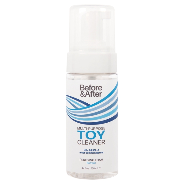 Before and After Toy Cleaner Puryfying Foam Refresh 4.4 ounces from Classic Erotica. Features: powered by naturally derived ingredients. Proven to kill 99.9% of germs. Antibacterial formula is easy to apply and fast acting. Triclosan free. Paraben free. Ingredients: Water, Cocamidapropyl PG-Dimonium Chloride Phosphate, Benzyl Alcohol, Disodium EDTA, Citric Acid, Sodium Hydroxide, Fragrance Parfum. Directions for use: if toy is electrical, unplug, disconnect before cleaning. If battery operated, remove batteries and replace battery cover. Apply a generous amount of cleaner to toy surface, being careful to avoid battery compartment. Rinse completely with water. Use a clean, lint free cloth to dry to ensure all moisture is removed. This product is not tested on animals. Made in USA. Categories: Sprays, Health and Beauty Aids, Toy Cleaner, Hygiene, Intimate Care. Restricted, Amazon Restricted. 2023.