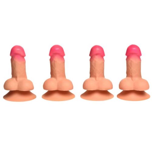 Four Mini Dildos! This fun pack includes four mini dildos that are designed to be noticed and are ready to stand upright on their own. With a strong suction cup base, they easily adhere to most flat surfaces. These little novelties make perfect gifts for bachelor or bachelorette parties, playful office decor, or for pranking your friends. Made from premium, phthalate-free, body-safe silicone, these mini dildos combine quality with cheeky fun. Stick them on your desk! Stick them on your dashboard or car! Decorate your friend’s bathroom or bedroom with them when they aren’t looking! These little peckers are fun for everyone, as long as they have a sense of humor! Whether it’s a comical gift or a harmless prank, these little peckers are packing a whole lot of fun!Measurements: Each dildo is 1.9 inches Length x 1.2 inches Width x 1.2 inches HeightMaterials: SiliconeColor: LightFour Mini Dildos!: This pack is packing 4 mini dildos that will stand out and stand up on their own!Suction Cup Base: The strong suction cup base sticks to most flat surfaces.Fun Adult Novelty Gift!: Whether you’re celebrating a bachelor or bachelorette party, spicing up your office decor, or playing pranks on friends, these novelty items are sure to shock some and bring a smile to others!Premium Silicone: Even though it’s small, it’s still made out of quality, phthalate-free, body-safe silicone!