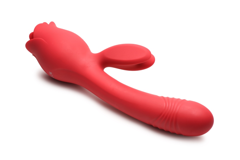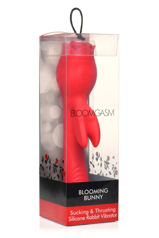 Bloomgasm Blooming Bunn Sucking and Thrusting Rabbit Vibrator from XR Brands. This Rose is the complete package when it comes to female satisfaction! The stem of the Rose is a slightly curved, flexible shaft with a round head and ribbing beneath the head. The Rabbit ears vibrate and rest against your clit as you enjoy the auto thrusting feature! There are 3 speeds of thrusting to enjoy that also turn on the vibration, too! Switch it around and use the rosebud and its powerful little suction hole to suck your Clit with 10 different intensities to choose from! These can be operated simultaneously or at the same time if your femme partner wants to join on one side! You can even take it in the shower, too! It is rated IPX6 waterproof so it can handle powerful jets, but should not be submerged underwater. Made out of premium quality, silky smooth Silicone, it is also body safe and phthalate free. Use only with water based lubricants for best results. To clean, wash with warm water and mild soap and then spray with a sex toy cleaner before patting dry. Recharge using the USB cable provided. Grab your water based lube and then use it liberally over your clit and the shaft and Rosebud. You can use the suctions on your nipples to warm them up, or buzz them against your breasts. Slide your hands between your thighs, making sure there is enough lube, and slip the shaft inside. Let the thrusting begin and allow yourself to get comfortable as you open up! The Rabbit ears tease your clit as the shaft thrusts inside you, rubbing against your G-spot. Switch it up and use the clit sucking Rose on your sensitive pearl until you’re nearing your peak of pleasure! Then switch to the thrusting shaft again and ride the waves of ecstasy! Use it alone or with a partner to spice things up! Measurements: overall length 9 inches. Insertable length 5.5 inches.Widest insertable diameter 1.4 inches. Suction hole diameter 0.5 inch. Materials: Silicone, ABS Plastic. Color: Red. Note: please use only with water based lubricants. Key features The Full Package Rose: this rose has everything! With dual motors, it gives you a budding rose that sucks your clit, an auto thrusting, ribbed shaft, and buzzing rabbit ears to stimulate your clit while the shaft is inserted! Features can be used simultaneously or separate. Thrusting and Vibration. Enjoy the flexible, curved and slightly ribbed shaft that auto thrusts while the ears vibrate. Enjoy 3 levels of thrusting and vibration! Intense suction. Enjoy 10 delicious levels of suction! Waterproof. Rated as IPX6, it can be taken in the shower too! Recharge using the USB cable provided between uses. Premium Silicone. Enjoy quality, body safe, premium, phthalate free Silicone. Categories: Valentine’s Day Item, Rabbit Style Vibrators, Eco-Friendly Sex Toys, Rechargeable Vibrators, Sex Toys for Women, G-Spot Rabbit Style Vibrators. 2024.