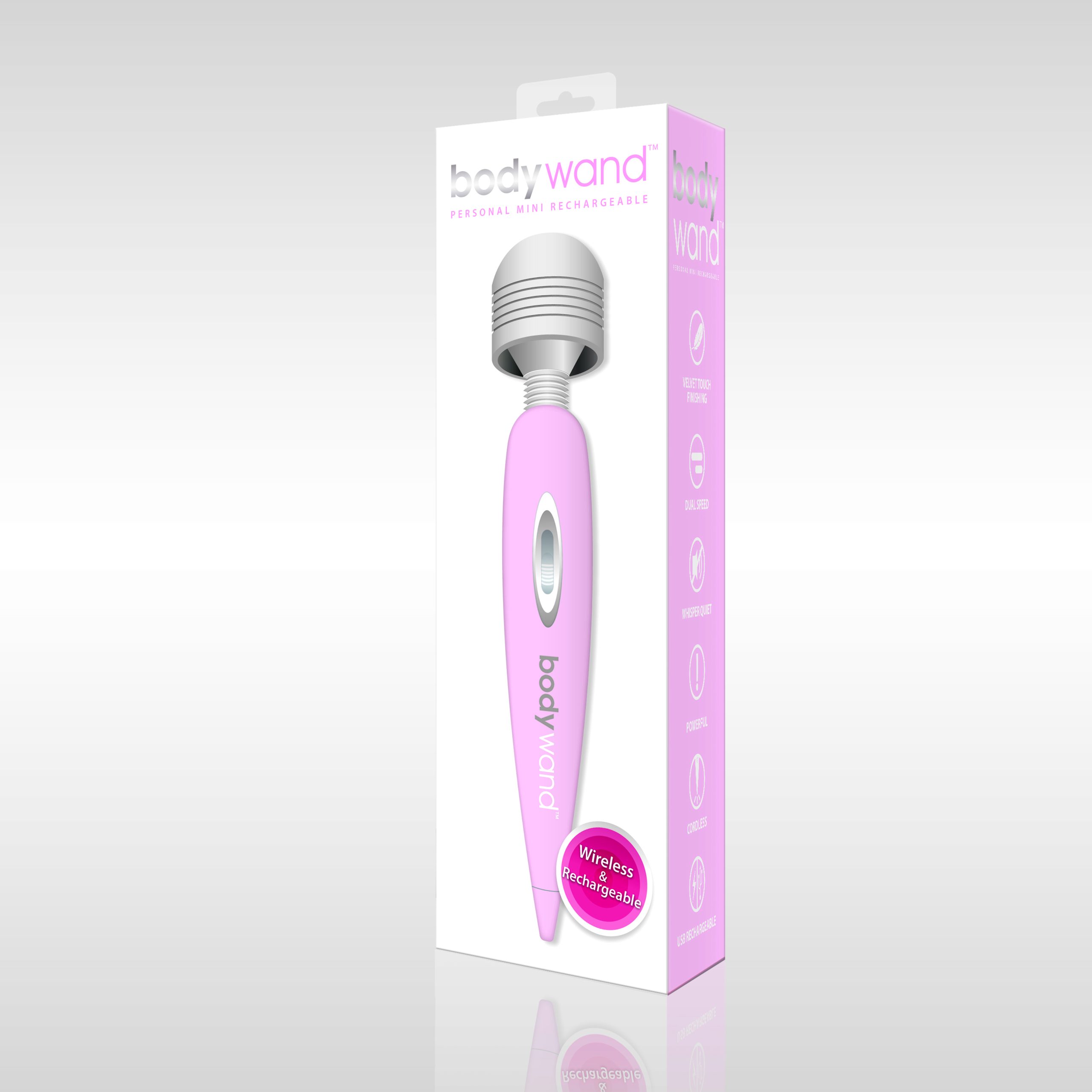 Bodywand Personal Rechargeable Mini Massager Pink USB features: one finger control. USB Rechargeable with charger indicator. Velvet Touch. Soft Touch. Dual speed. Whisper quiet. Powerful. Wireless and rechargeable. Bodywand personal massager for every part of your body. Colors may vary. Bodywand is a registered trademark for X-Gen Products. Categories: Vibrators, Rechargeable Vibrators, Solo Body Massagers, Health and Beauty Aids. Restricted, Amazon Restricted. Video. 2023.