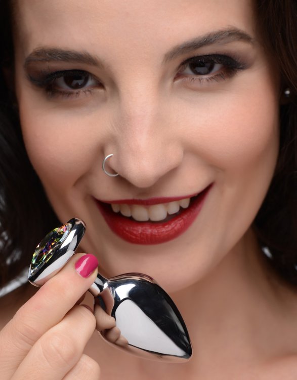 Booty Sparks Prism Heart Anal Plug Medium from XR Brands. Adorn your derriere with this heart shaped Rainbow Prism butt plug! The Heart shaped rainbow gem adds dazzling lustful energy to your booty, while the medium size and satisfying weight qualify this brilliant butt plug as the main event or a warm up for those with more anal experience. Made with Nickel free Aluminum Alloy for a super smooth, non porous, body safe experience! Compatible with both Water Based Lubricant and Silicone Based Lubes so you can use any kind of lubricant for a comfortable anal session. The satisfying weight and density are sure to please anal players of every lover. Excellent for temperature play, heat it up or chill it down for a variety of different back door sensations. Clean before and after use with warm water and mild antibacterial soap or toy cleaner. Insert and dazzle your lover with this seductive Heart Shaped gem and get their engines going! Measurements: total length 3.2 inches, 1.3 inch widest insertion width. Materials: Nickel free Aluminum Alloy. Color: Rainbow end stone. Categories: Anal Toys, Small and Medium Butt Plugs, Sex Toys for Couples, Holiday Item, Valentine’s Day Gift. 2023.