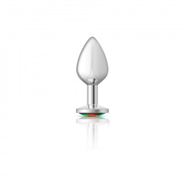 Cheeky Charms Round Rainbow Medium Silver Butt Plug from Viben. Cheeky Charms is a collection of vibrant, seductive metal anal plugs, each show casing a beautiful acrylic gem stone. These butt plugs are great for temperature play and anyone who wants to decorate their rear entrance. Tapered for easy insertion and designed with a flared base and thin stem. Cheeky Charms anal plugs are comfortable to wear for an extended period of time. Wearable during intercourse to achieve a fuller feeling. Available in various unique colors and sizes. Cheeky Charms are the perfect booty jewelry for women, men, couples and also for solo play. Medium, silver metal, tear drop shaped anal plug with sparkling Rainbow colored, round Acrylic gem stone. Hypoallergenic, nonporous, body safe, Nickel free, Aluminum alloy, anal jewelry compatible with all lubricants. Easy to clean and dishwasher safe butt plugs. Available in various colors and three different sizes. Specifications: body safe materials. Nonporous, smooth surface. Aluminum Alloy. Nickel free. Ideal for temperature play. Never warm in a microwave. Run hot water and Aluminum place plug to warm. Or a chilly butt plug in a tub of ice. Tapered, tear drop shape. Thin Stem. Flared base Anal Plug. Rainbow Acrylic Gem Stone. Light weight. Easy to clean. Waterproof, non-vibrating anal sex toy. RoHS Certified, Prop 65 Compliant. 1 year Limited Warranty. Measurements: overall length 3.23 inches, insertion length 2.03 inches, circumference 4.21 inches around. Material: Aluminum Alloy Butt Plug, Acrylic Gem Stone. Categories: Anal Toys, Prostate Massagers, P-Spot Stimulators, Sex Toys for Couples, Health and Beauty Aids, Small, Medium Butt Plugs. Restricted, Amazon Restricted. 2022.