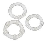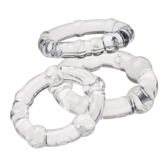 Cloud 9 Novelties Super Stretch Beaded Stay Hard Ring Clear Combo Pack includes three sizes of super soft skin safe rings. These ring can help you stay harder longer and prolong ejaculation. Cloud 9 cock rings are made of phthalate free, non-toxic thermoplastic rubber TPR. The smallest ring is for maximum erections; the medium ring is for harder erections; the large ring can encircle the upper part of your scrotum to help prevent premature ejaculation. The rings are comfortable and made specifically for your safety and hygiene during your intimate play. Cloud 9 cock rings can be used individually or together. Cock rings give you a longer lasting erection by trapping the blood supply in the penis and intensifying your orgasm! Cock rings are ideal for men suffering from erectile dysfunction ED and premature ejaculation. Always use a water based personal lubricant with this product for maximum pleasure. Do not wear a cock ring for more than 30 minutes at a time. Rings specification: small ring .75 inch, medium ring .85 inch, large ring .9 inch, total packaged weight .04 pound. Phthalate free, body safe Thermoplastic Rubber TPR. Manufactured for Cloud 9 Novelties. Made in China. Categories: Love Rings, Classic Cock Rings, Men’s Cock and Ball Gear, Cock Ring Trios. MAPs price. 2023.