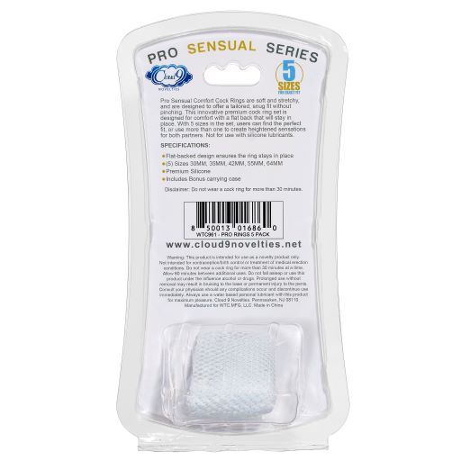 Cloud 9 Comfort Cock Rings with Flat Back 5 Pack Pro Sensual Line. SKU number WTC961 Cloud 9 Pro Sensual Comfort Cock Rings with Flat Back Design 5 different sizes Pack. UPC number: 850013016860. Cloud 9 Pro Sensual Comfort Cock Rings are soft and stretchy, featuring an extra wide design for maximum comfort and a flat back to keep them in place and prevent rolling. Multiple sizes allow users to find the perfect fit, and the set comes with a Bonus Mesh Pouch for storage. Use only with water based lubricants. Please note: cock rings should not be worn for longer than 30 minutes. Dimensions: the set comes in 5 sizes: 30mm, 35mm, 42mm, 55mm, 64mm e or approximately 1.18 inches, 1.37 inches, 1.65 inches, 2.16 inches, 2.51 inches. Categories Comfort Cock Rings: Love Rings, Cock Rings, Sensual Kits, Men’s Cock, Ball Gear. Restricted, Amazon Restricted. 2023.