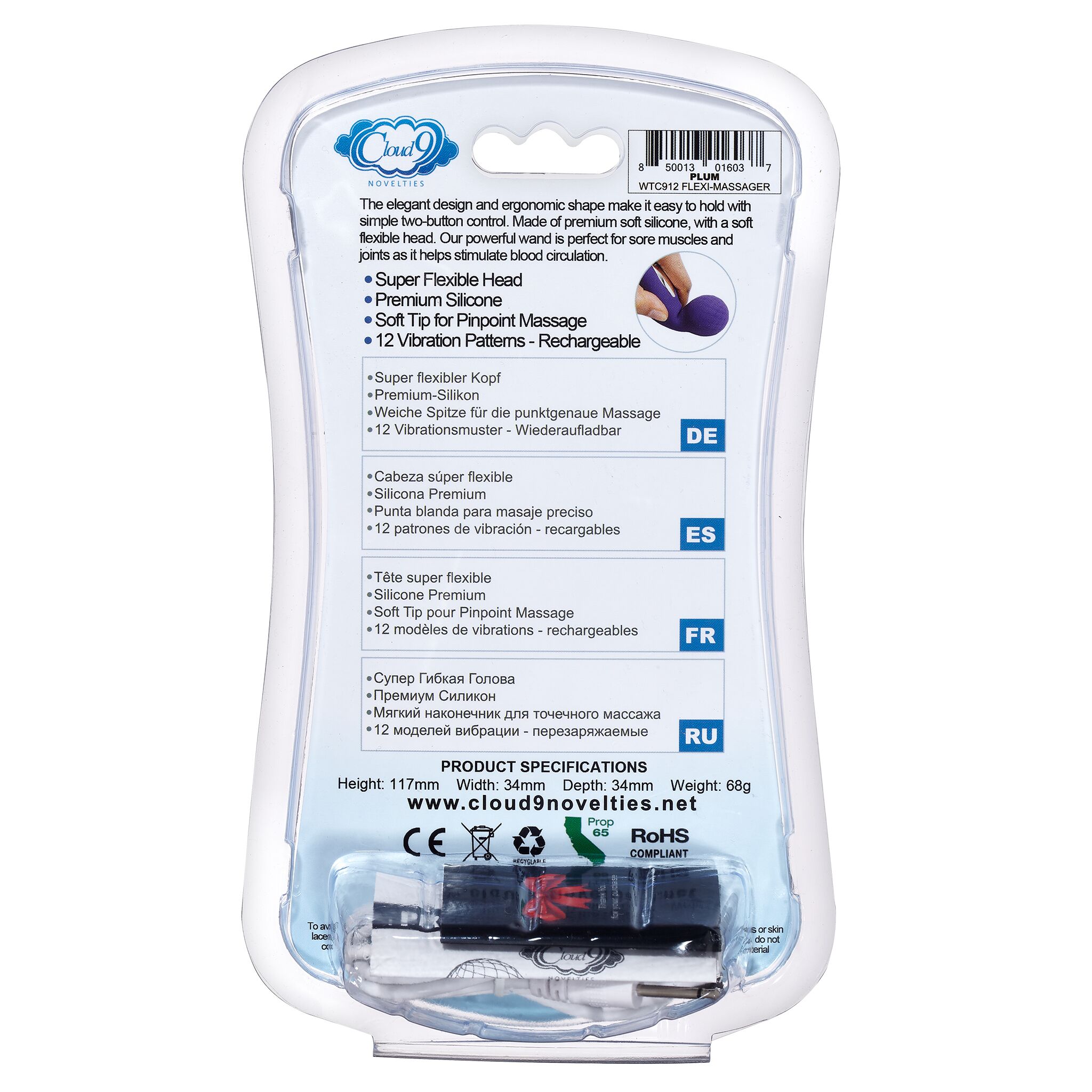Cloud 9 Health and Wellness Flexi Massager Rechargeable Wand Plum. The elegant design and ergonomic shape make it easy to hold with a simple two button control. Made with premium Silicone with a soft flexible head. Our powerful wand is perfect for sore muscles and joints it helps stimulate blood circulation. Feature Body safe latex free and phthalate free materials. 12 vibrating functions. Flexible head. Rechargeable via USB. Charging cord included. Specifications: approximately 4.60 inches by 1.33 inches. Bulk weight approximately 2.4 ounces. 30 days warranty. Categories: Rechargeable Vibrators, Magic Wands, Body Massagers, Solo Body Massagers, Sex Toys for Women. Video. MAPs price $44.95 added. 2022.