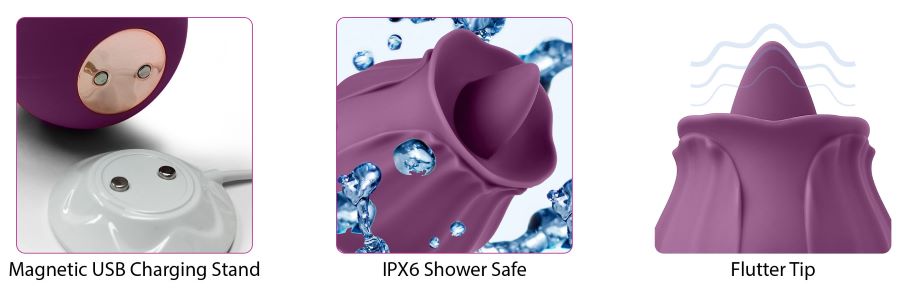 Cloud 9 Health and Wellness Flutter Oral Tongue Stimulator Plum. The Oral Tongue Stimulator reproduces a realistic oral sex experience for use with clitoral or nipple stimulation. Apply a small amount of water based personal lubricant to the soft flickering Silicone Tongue. Switch the stimulator on and experience orgasms sensations as the Tongue licks your clitoris or nipples. Features body safe, hypoallergenic, hygienic and odorless. 10 adjustable stimulation modes. Rechargeable battery includes magnetic charger base. Size approximately 3.03 inches by 2.24 inches. 30 days warranty. Categories: Rechargeable Vibrators, Tongue Vibrators, Oral Products, Sex Toys for Women. New video. MAPs price $54.95 added. New image added with 3 specifications of the Tongue Clitoral Stimulator: magnetic USB Chargeable, IPX6 Shower safe. Flutter Tip Clitoral Stimulator image added. Restricted, Amazon Restricted. 2022.