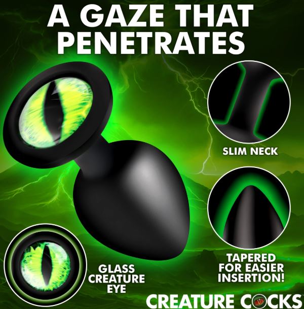 Turn your fantasies into reality with the Creature Eye Silicone Butt Plug! This alluring toy features a vivid green cat-eye, making a bold statement when playing with a partner. Crafted from high-quality, body-safe silicone, it offers a smooth and delightful touch. The design includes a tapered tip for effortless insertion, paired with a slim neck and a wide base to guarantee it stays put. Elevate your intimate moments with a touch of fantasy, enjoying both comfort and a unique visual appeal that will leave your partner enchanted by your gaze!Key Features:Fantasy Butt Plug: Gaze into the vibrant green cat-eye as you play with your partner’s behind! Show off this glass eye as you tuck it inside your booty!Smooth Silicone: Made from premium quality, silky smooth, body-safe silicone.Booty-Safe: The tapered tip makes insertion easy while the slim neck and wide base keeps it in place and stops it from going too far in the derriere.Measurements:Overall length: 3.3 inchesInsertable length: 3 inchesWidest insertable diameter: 1.4 inchesMaterials: Silicone, glassColor: Green, blackNote: Use only with water-based lubricants.