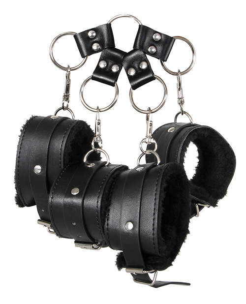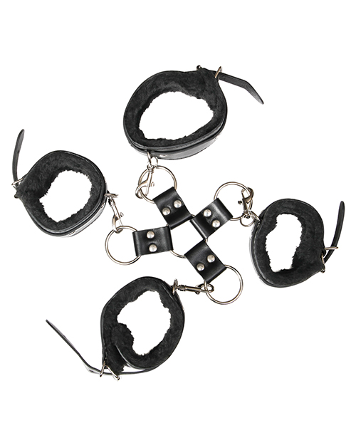 Adam and Eve’s Hog Tie from Evolved Novelties. Classic hog tie with cross restraint and 4 adjustable cuffs. Looking for a little wild wet kink to your next bedroom rodeo? The Hog Kit lets you rope your lover and hold them in place for what ever sexy moves you have in mind. And they will be sitting pretty in total comfort thank to the adjustable faux fur lined ankle and wrist cuffs. The Hog Tie Kit ensures all four limbs are safely held in place. And those metal buckles and rivets give you naughty bondage styling too. Kit includes 2 handcuffs, 2 ankle cuffs, 1 hog tie. Made using flexible vegan leather, soft faux fur and metal. 5 years warranty. Categories: Bondage, Fetish, Kink, Bondage Restraints, Cuffs, Sex Toys for Couples, Men, Women. Video. 2023.