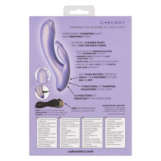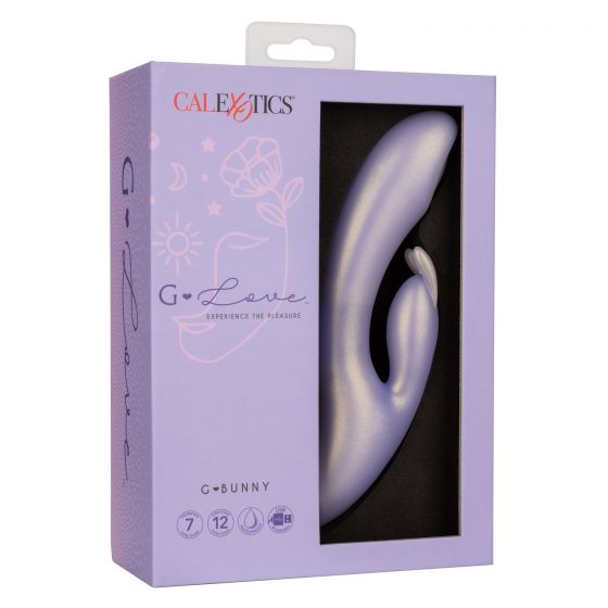 G-Love G-Bunny Rabbit Style Vibrator from California Exotic Novelties. The gorgeous G-Love G-Bunny is a dual stimulating massager with vibrating shaft and thumping pulsation stimulator. Love yourself just right with the flexible G shaft, 7 independent functions of thumping action and 12 independent functions of vibrations. The sensually curved thumping shaft and flickering rabbit stimulator are perfect for teasing internal and external sweet spots. For an ultra smooth surface and flexible body, the flickering stimulator and massager are covered in a shimmering Silicone. This silky smooth vibrator is packed with 12 functions of vibration and 7 independent functions of thumping stimulation made just for you. The high tech memory chip remembers just how you like it resumes play on the last function used. Whether you are taking a dip with a lover or indulging in a steamy solo session, look forward to up to 1 hour of waterproof vibration. Recharge pleasure and get back to playtime in only 2 hours with the provided USB cable. The flexible massager is made from a hygienically superior silicone. This body safe material is unscented and phthalate free to keep your most sensitive spots happy and healthy. Specifications Color Purple. MaterialsSilicone, ABS Plastic with Metallic Plating. Power Source USB Rechargeable included. FeaturesPhthalate Free, Waterproof, Rechargeable, Vibrates. 1 year warranty. Maximum run time 66 minutes. Maximum charging time 120 minutes. Measurements 7.5 inches by 1.5 inches overall. 5 inches by 1.25 inches shaft. 2.5 inches by 0.75 inch stimulator. Categories: Rabbit Style Vibrators, Eco-Friendly Sex Toys, Rechargeable Vibrators, Sex Toys for Women, G-Spot, Clit Stimulators, G Spot Rabbit Style. 2023.