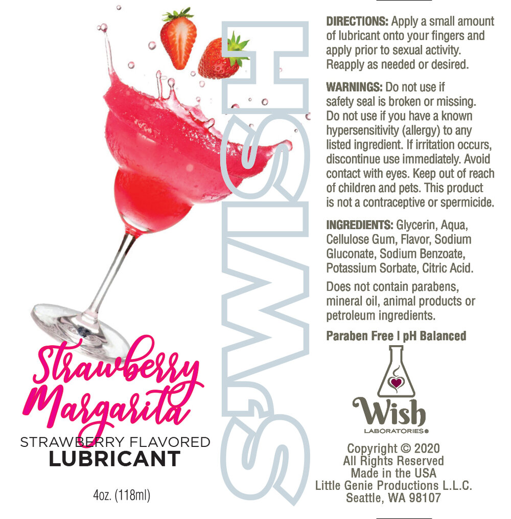 Cocktail inspired lubricants. Swish Strawberry Margarita 4 fluid ounces from Little Genie Products. Whether you like to play alone or with friends, Swish cocktail inspired lubes are made from top shelf ingredients. Pick your pleasure and enjoy the smooth glide of Swish lubricants. Directions: apply a small amount of lubricant on your fingers and apply before sexual activity. Reapply as needed or desired. Warnings do not use if safety is broken or missing. Do not use if known hypersensitive or allergies, to any listed ingredient. If irritation occurs discontinue use immediately. Avoid contact with eyes. Keep out of reach of children. This is not a contraceptive or spermicide. Ingredients Glycerin, Water, Cellulose Gum, Flavor, Sodium Benzoate, Potassium Sorbate, Citric Acid. Does not contain Parabens, Minerial Oil, Animal Products, or Petroleum Ingredients. Paraben free pH Balanced. Strawberry Flavored Lubricant. Wish Laboraties. Little Genie Productions LLC. Made in the USA.