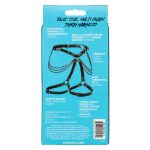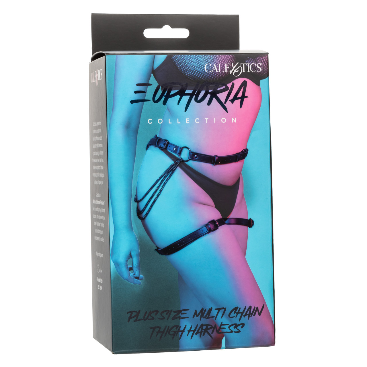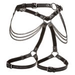 Euphoria Plus Size Multi Chain Thigh Harness from California Exotic Novelties. Experience the ultimate passion and embrace your curves with the Euphoria Collection Plus Size Multi Chain Thigh Harness. This premium harness is designed to accommodate plus sizes, providing comfort, support, and a heightened sense of sensuality. Whether you are looking to spice up your intimate moments or add a unique touch to your festival outfits, this multi chain thigh harness is the perfect choice to make a bold statement. The waist and thigh straps of this harness are easily adjustable, ensuring a secure and customized fit with a reliable buckle closure. The functional, durable, and contemporary design ensures long lasting performance, allowing you to fully indulge in your desires. Feel the luxurious softness of the plushy velvet interior against your skin, while the vegan leather exterior adds a touch of sophistication and allure. The sturdy construction, featuring double padding and stitching, ensures both durability and comfort, allowing you to explore with confidence. Enhanced with non-tarnishing metal accents, this thigh harness exudes elegance and adds visually stunning and enticing appeal. Embrace your sensual side and elevate your pleasure with the Euphoria Collection Plus Size Multi Chain Thigh Harness. Let it empower you, celebrate your curves, and create unforgettable experiences that cater to your unique desires. Specifications: SKU SE-3102-16-3. Color Black. 1 Year Warranty. Features: Wearable, Phthalate free, Adjustable. Material type: PVC Fabric, Polyester Velour lining, Iron Metal accents. Measurements: 49.25 inches maximum waist circumference. 34 inches maximum thigh circumference. Bulk weight: 18.2 ounces. Package 20.1 ounces. Package: 2.75 inches by 4 inches by 8.25 inches. Categories: Lingerie, Clothing, Bondage, Fetish, Kink, Naughty Role Play, Plus Size, Body Harnesses. 2024.