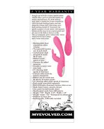Evolved Bunny Rabbit style vibrator. Pretty in pink! Snuggle up with this creamy smooth rabbit vibrator that is got two powerful motors for intense dual pleasure. Its sleek bulbous main shaft is angled for G-spot stimulation while the hard working bunny ears bop along the clitoral shaft, delivering you a body melting double O! Customize the speed or pattern of each motor with separate buttons on the easy to use control panel and get cozy in the bath or shower as this vibe is completely water submersible. Two powerful motors, one in each shaft. Arched main shaft designed to reach the G-spot. Bulbous head tapers to base.Textures for added sensation. Flexible to move with your body.10 vibrating shaft speeds and functions.Clitoral rabbit shaft for intense stimulation. Robust ears and round nose for plenty of contact points. Height 7.89 inches, depth 2.42 inches, width 1.45 inches. Waterproof vibrations and submersible. Phthalate and latex free materials Silicone shaft, ABS Plastic base. Rechargeable, USB cable included. 5 year warranty.
