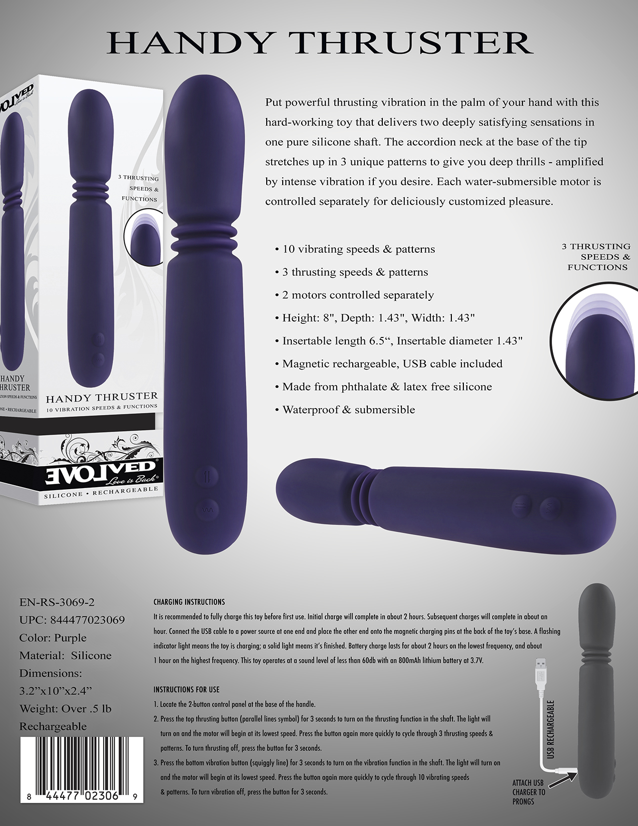 Evolved Handy Thruster Blue Vibrator for Evolved Novelties. Handy Thruster! Put powerful thrusting vibration in the palm of your hand with this hard working sex toy that delivers two deeply satisfying sensations in one pure Silicone shaft. The accordion neck at the base of the tip stretches up in 3 unique patterns to give you deep thrills: amplified by intense vibration if you desire. Each water submersible motor is controlled separately for deliciously customized pleasure. Handy Thruster features: 10 vibrating speeds and patterns. 3 thrusting speeds and patterns. 2 motors controlled separately. Size height 8 inches, depth 1.43 inches, width 1.43 inches. Insertable length 6.5 inches, insertable diameter 1.43 inches. Magnetic rechargeable, USB cable included. Made from body safe, phthalate free and latex free Silicone. Waterproof vibrations. Submersible water play. Do not use oil base personal lubricants. These can corrode the toys materials. Care: clean product with toy cleaner or soap and water. Followed by a warm water rinse. Pat dry before storing. Categories: Vibrators, Classic Vibrators, Rechargeable Vibrators, Palm Size Massagers. 2023.