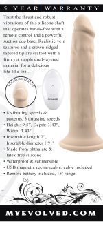 Evolved In Thrust We Trust Light Vibrating Dildo. Trust the thrust and robust vibrations of this Silicone shaft that operates hands free with a remote control and a powerful suction cup base. Realistic vein textures and a crown ridged tapered tip are crafted with a firm yet supple dual layered material for a delicious life like feel. Features: 8 vibrating speeds and patterns, 3 thrusting speeds. Size height 9.5 inches, depth 3.43 inches, width 3.43 inches. Insertable length 7 inches, insertable diameter 1.91 inches. Made from phthalate free and latex free Silicone. Waterproof vibrations and submersible for bath tub play. USB magnetic rechargeable, cable included. Remote battery included, 15 feet range. Recharge takes 2 hours. 90 minutes of play. Always clean before and after use and between partners. Please only use a water based personal lubricant. Categories: Vibrators, Rechargeable Vibrators, Dildos, Dongs, Realistic Vibrating Dildo, Realistic Large Dildo, Dildos and Dongs Realistic. 2023.