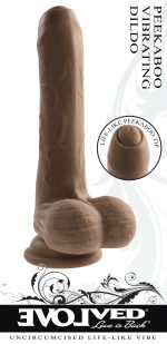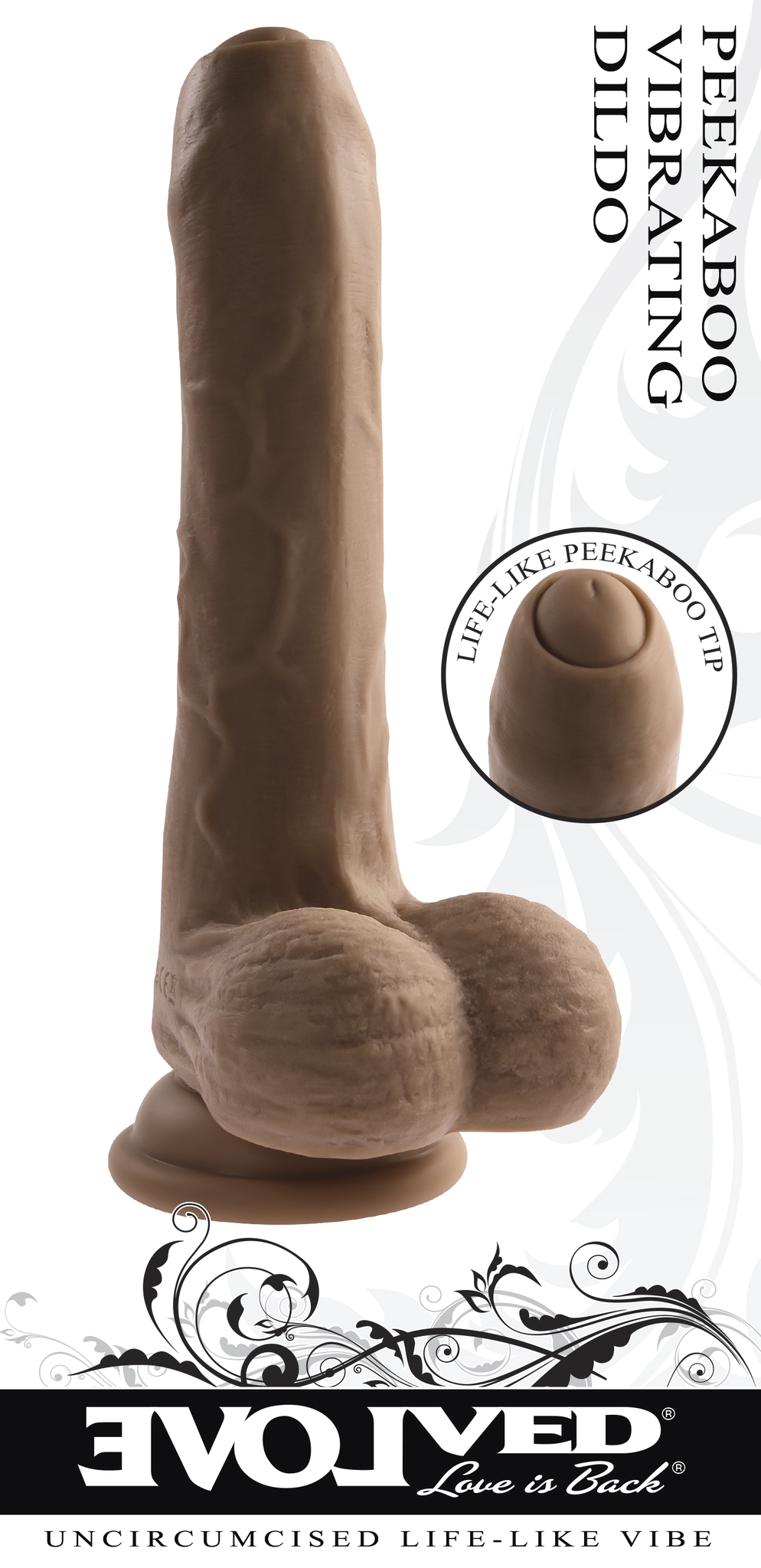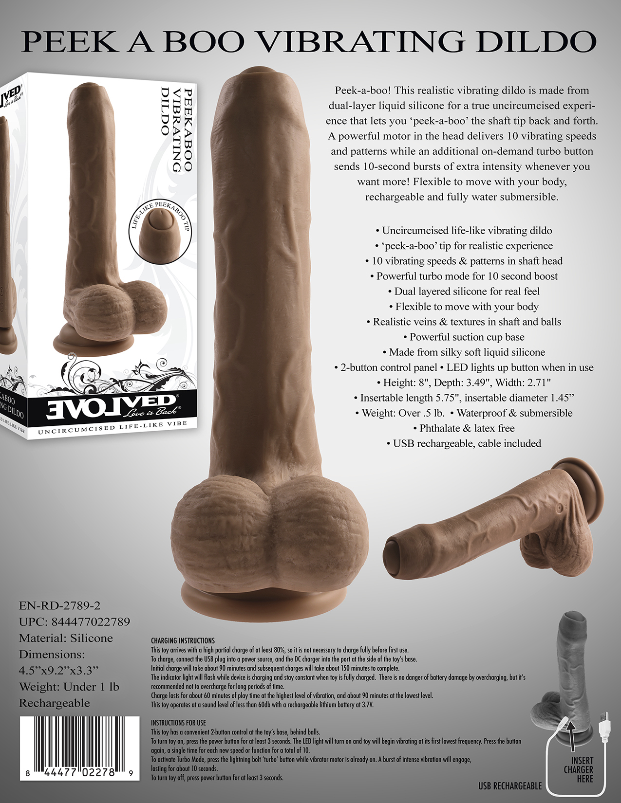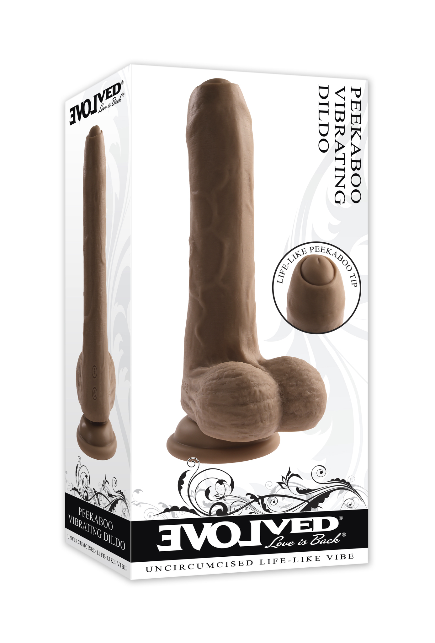 Evolved Peek A Boo Vibrating Dildo Dark Skin Tone. Peek A Boo Vibrating Dildo Dark Peek-A-Boo! This Realistic Vibrating Dildo is made from dual layer liquid Silicone for a true uncircumcised experience that lets you Peek-A-Boo the shaft tip back and forth. A powerful motor in the head delivers 10 vibrating speeds and patterns while an additional on demand turbo button sends 10 second bursts of extra intensity whenever you want more! Flexible to move with your body, rechargeable and fully water submersible. Features: Uncircumcised life like vibrating dildo. Peek-A-Boo tip for a Realistic experience. 10 vibrating speeds and patterns in shaft head. Powerful turbo mode for 10 second boost. Dual layered silicone for real feel. Flexible to move with your body. Realistic veins and textures in shaft and balls. Powerful suction cup base. Made from silky soft liquid Silicone. 2 button control panel. LED lights up button when in use. Height 8 inches. Depth 3.49 inches. Width 2.71 inches. Insertable length 5.75 inches. Insertable diameter 1.45 inches. Bulk weight over half a pound. Waterproof and submersible. Phthalate free and latex free. USB rechargeable, cable included. Categories: Vibrators, Rechargeable Vibrators, Dildos, Dongs, Realistic Vibrating Dildos, Dildos and Dongs Realistic. 2023.