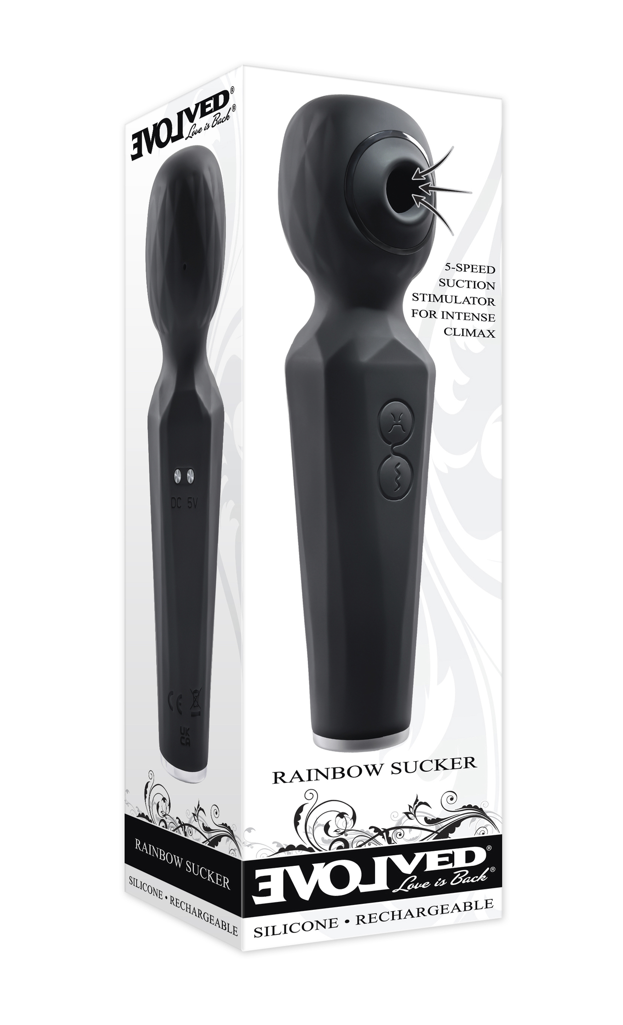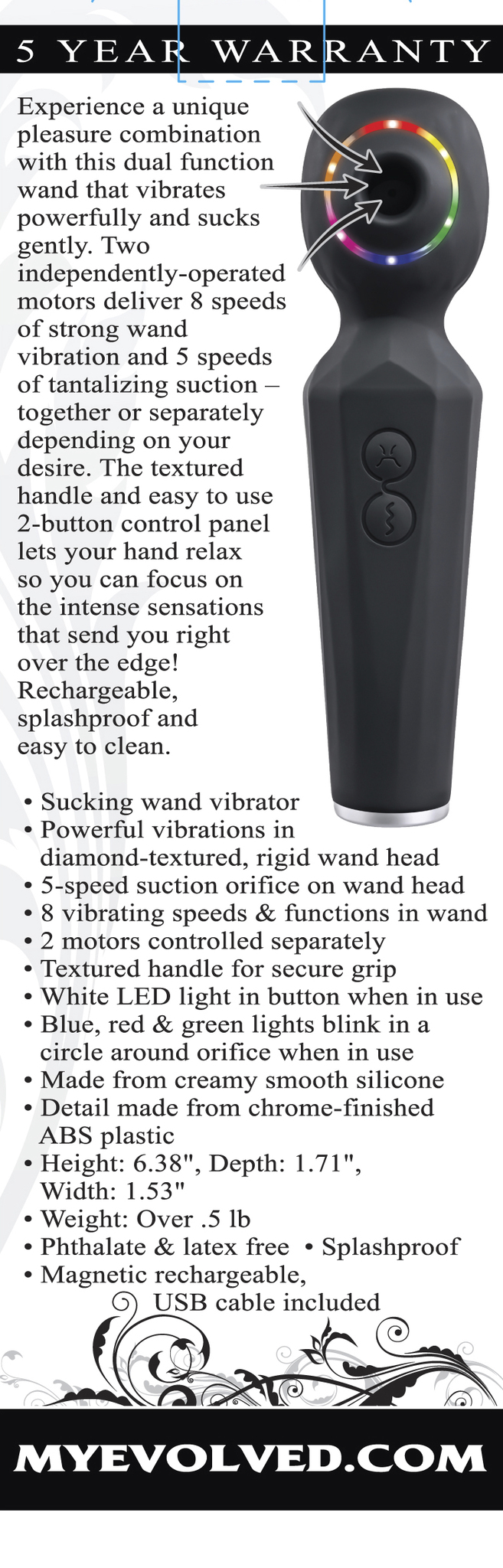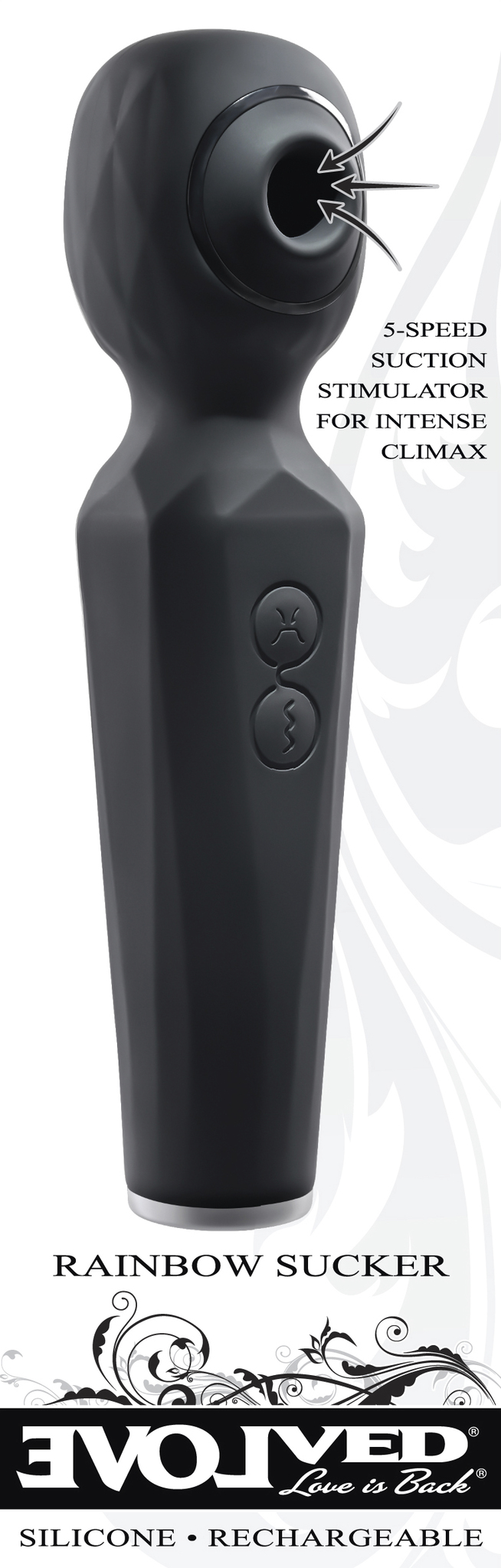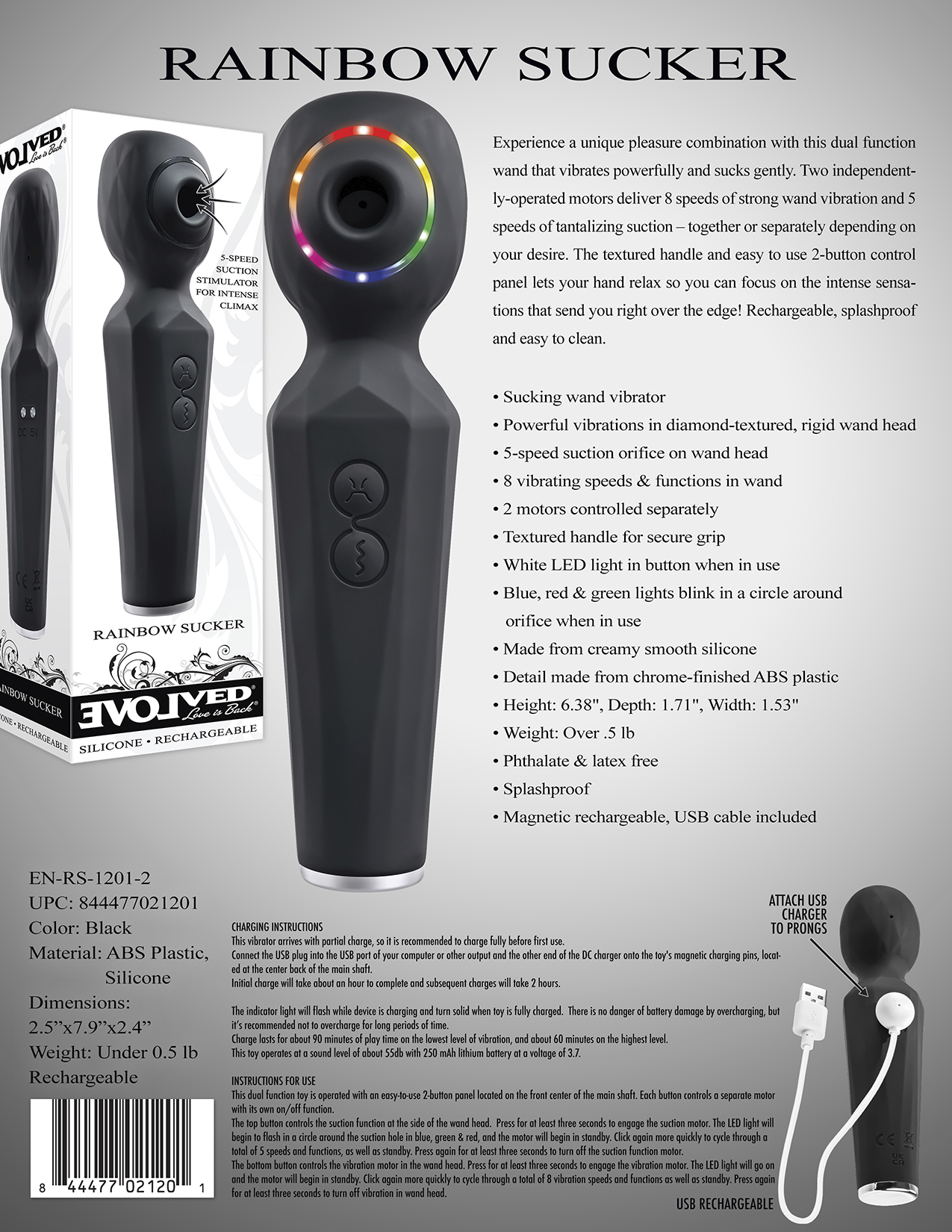 Evolved Rainbow Sucker Wand Vibrator. Experience a unique pleasure combination with this dual function wand that vibrates powerfully and sucks gently. Two independently operated motors deliver 8 speeds of strong wand vibration and 5 speeds of tantalizing suction, together or separately depending on your desire. The textured handle and easy to use 2 button control panel lets your hand relax so you can focus on the intense sensations that send you right over the edge! Rechargeable, splashproof and easy to clean. Features: sucking wand vibrator. Powerful vibrations in diamond textured, rigid wand head. 5 speed suction orifice on wand head. 8 vibrating speeds and functions in wand. 2 motors controlled separately. Textured handle for secure grip.White Light Emitting Diode LED light in button when in use. Blue, red and green lights blink in a circle around orifice when in use. Made from creamy smooth Silicone. Detail made from chrome finished ABS plastic. Size height 6.38 inches, depth 1.71 inches, width 1.53 inches. Weight: over half a pound. Phthalate free, latex free. Splashproof for play in the shower. Magnetic rechargeable, USB cable included. Categories: Rechargeable Vibrators, Magic Wands, Body Massagers, Solo Body Massagers, Palm Size Massagers, Health and Beauty Aids. 2022.
