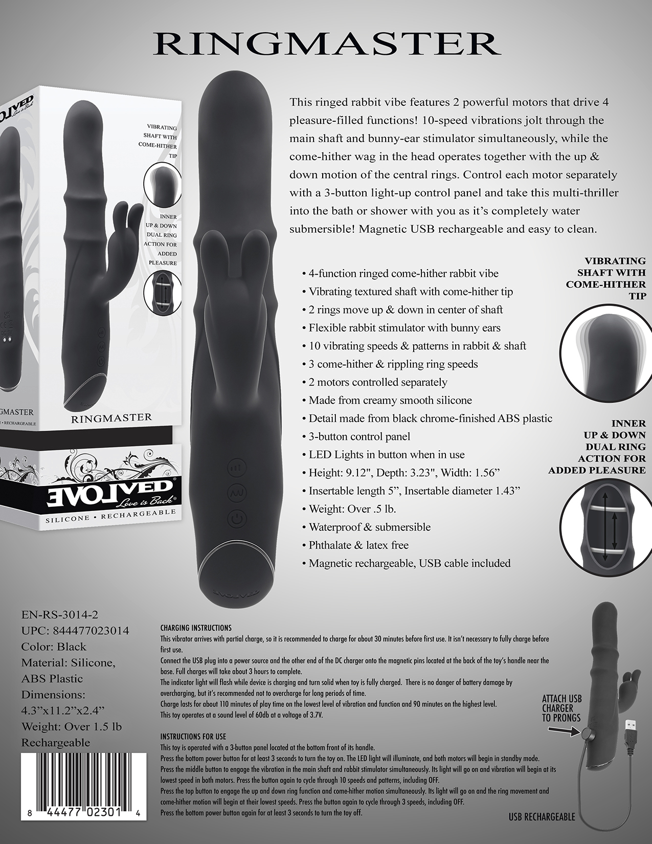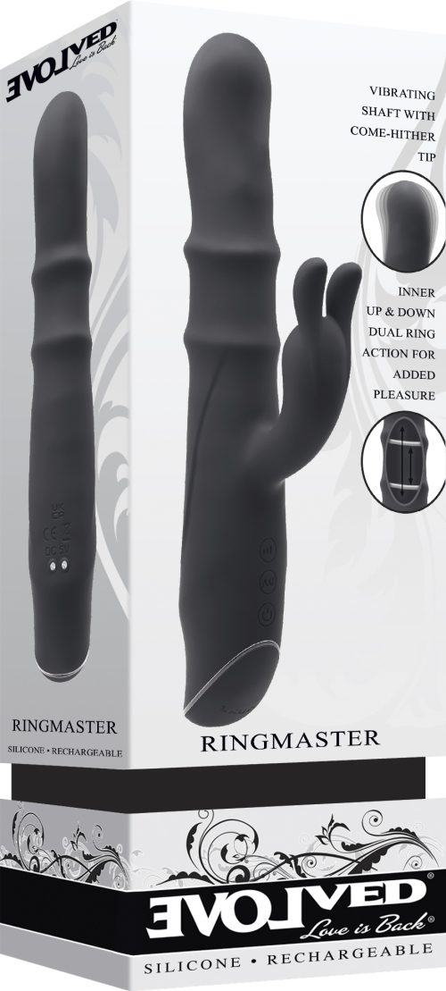 Evolved Ringmaster Rabbit Vibrator. This Ringed Rabbit Vibrator features 2 powerful motors that drive 4 pleasure filled functions! 10 speed vibrations jolt through the main shaft and bunny ear stimulator simultaneously, while the come hither wag in the head operates together with the up and down motion of the central rings. Control each motor separately with a 3 button light up control panel and take this multi-thriller into the bath or shower with you as it is completely water submersible! Magnetic USB Rechargeable and easy to clean. Features: 4 function ringed come hither Rabbit Vibrator. Vibrating textured shaft with come hither tip. 2 rings move up and down in center of shaft. Flexible Rabbit stimulator with Bunny Ears. 10 vibrating speeds and patterns in Rabbit and Shaft. 3 come hither and rippling ring speeds. 2 motors controlled separately. Made from creamy smooth Silicone. Detail made from black chrome finished ABS Plastic. 3 button control panel. LED Lights in button when in use. Height 9.12 inches. Depth 3.23 inches. Width 1.56 inches. Insertable length 5 inches. Insertable diameter 1.43 inches. Bulk weight over half a pound. Waterproof and submersible. Phthalate free and latex free. Magnetic rechargeable, USB cable included. Categories: Vibrators, Rabbit Style Vibrators, Rechargeable Vibrators, G-Spot Rabbit Style Vibrators. 2023.