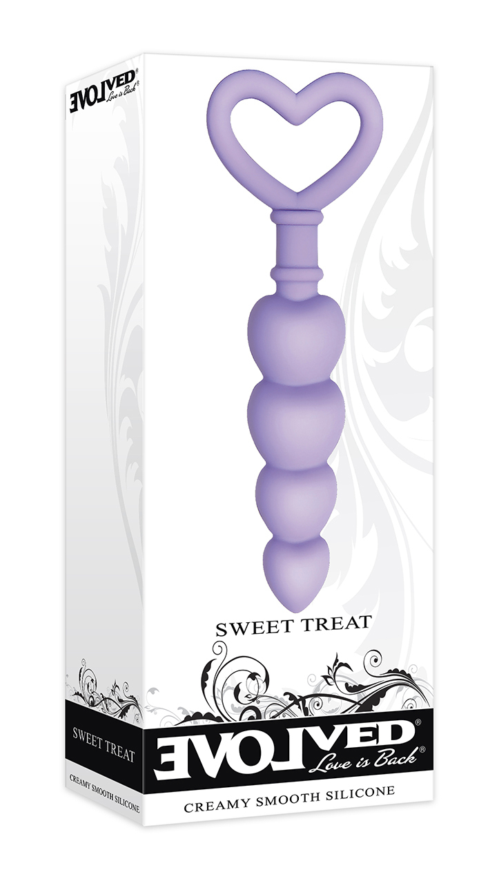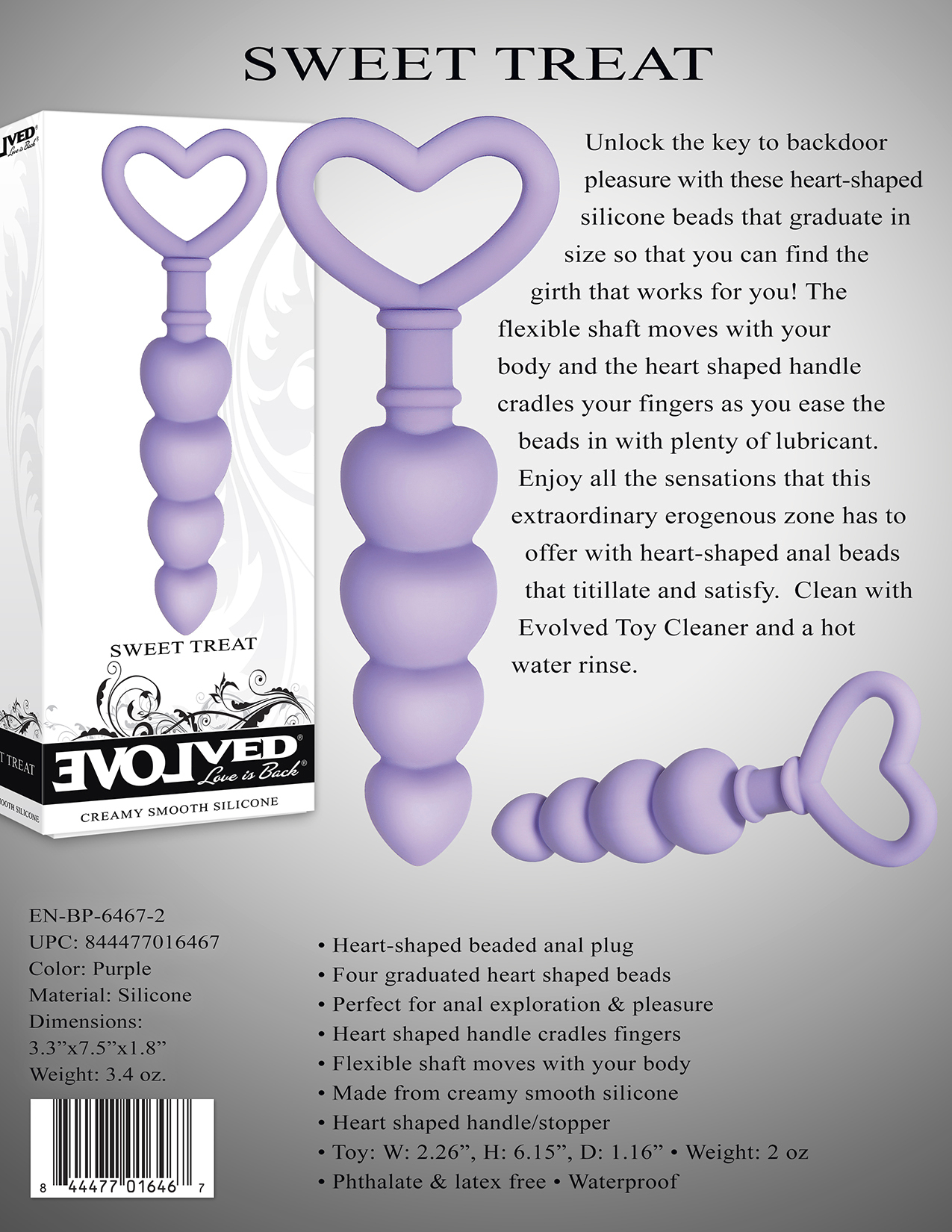 Sweet Treat Purple Anal Plug from Evolved Novelties. Heart shaped beaded Anal Plug. 4 graduated heart shaped beads. Perfect for anal exploration and pleasure. Heart shaped handle cradles finger. Flexible shaft moves with your body. Made from creamy soft Silicone. Size 1.16 inches in width, 6.15 inches in height, 1.16 inches in depth. Bulk weight 2 ounces.. Phthalate free and latex free. Color Purple. Package 3.3 inches in width by 7.5 inches in height by 1.8 in depth. Weight 3.4 ounces. Always clean before and after use with sex toys cleaner. Categories: Anal Toys, Small and Medium Butt Plugs, Anal Beads, Valentine’s Day Gift. 2023.