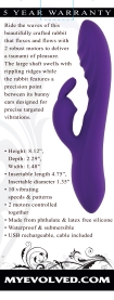 Evolved Wavy Rabbit Vibrator from Evolved Novelties. Wavy Rabbit Evolved Novelties SKU: EN-RS-4097-2. UPC: 844477024097. Ride the waves of this beautifully crafted Rabbit Vibrator that flexes and flows with 2 robust motors to deliver a tsunami of pleasure. The large shaft swells with rippling ridges while the Rabbit Vibrator features a precision point between its bunny ears designed for precise targeted vibrations. Size: Height 8.12 inches, Depth 2.29 inches, Width 1.48 inches. Insertable length 4.75, Insertable diameter 1.35 inches. 10 vibrating speeds and patterns.2 motors controlled together. Made from body safe phthalate free and latex free Silicone. Waterproof vibrations and submersible. USB rechargeable, cable included. 5 years warranty. Categories: Vibrators, Rabbit Style Vibrators, Eco-Friendly Sex Toys, Rechargeable Vibrators, Sex Toys for Women, G-Spot Rabbit Style Vibrators. 2024.