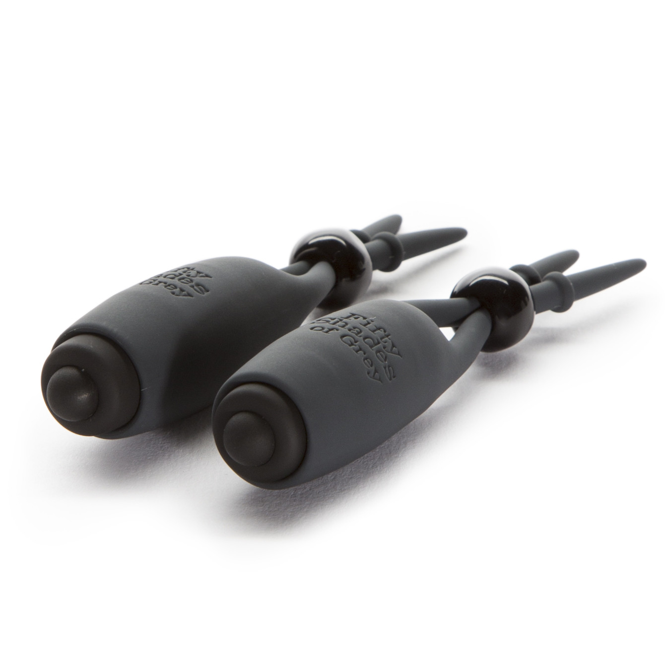 Fifty Shades of Grey Weekend Collection Sweet Torture Vibrating Nipple Stimulators Gray from Lovehoney the sexual happiness people. Gentle sensation becomes body trembling titillation with Sweet Torture, a set of bullet powered vibrating nipple teasers. Velvet soft Silicone features a slide to fit toggle that holds without pinching, so you feel nothing but stunning stimulation. Features of Fifty Shades of Grey Silicone vibrating nipple teasers. Channel sweet sensations to your nipples. Slide to fit toggle fits snugly without pinching. Holds in place independently for hands free stimulation. Single speed bullet can be removed. 100% waterproof vibrations. Size 4.5 inches in length. Warnings: keep out of reach of children. Contains hazardous batteries that can cause serious injuries if swallowed or placed inside any part of the body. If the battery compartment does not close securely, stop using the product and keep it away from children. Seek medical attention immediately if it is suspected the batteries have been swallowed or placed inside any part of the body. Store spare batteries securely. Dispose of used batteries immediately and safely. Categories: Bondage, Fetish, Kink, Nipple Play, Sensual Kits, Bondage Kits, Kinky Sets. Restricted, Amazon Restricted. 2023.