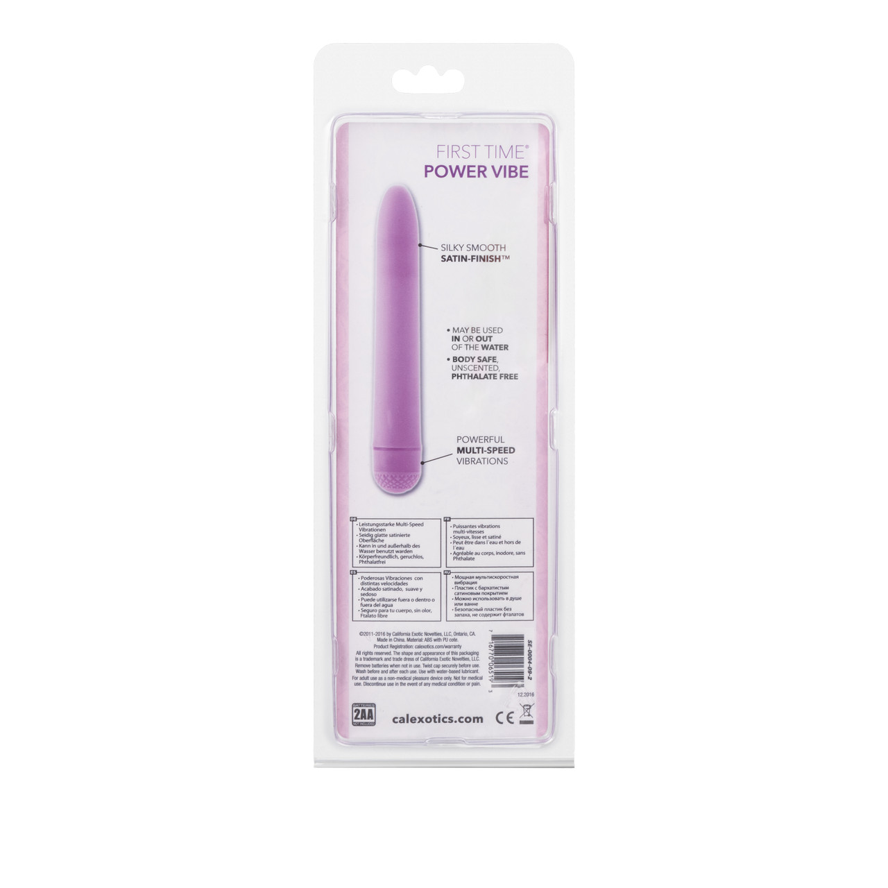 First Time Power Vibe Purple Pleasure Toys Hard Vibrator from California Exotic Novelties. Velvety soft pleasure products designed for first time or experienced users. Make it a memorable experience with the First Time Collection! The alluring First Time Power Vibe has a smooth, velvety finish to enhance your pleasurable experiences. The erotic, multi-speed, battery powered stimulator measures 6 inches by 1 inch and guarantees unlimited intimate sensations. The funky massager has a solid, smooth shaft, curved rounded tip, and an easy control multi-speed function. To change the intensity of your sensual experience simply twist the end cap and take charge of your pleasure. To stimulate the senses and imagination even further you can use this power packed waterproof vibe in the bath or shower. The vibes generous size makes it the ideal toy for creative, imaginative, seductive and fun solo encounters, or exotic couples play. The velvety smooth massager is easy to use and soft to the touch. 2 AA batteries are all that is required for unlimited memorable fun. The multi-speed vibration power function allows you to take full control of your pleasure, day or night. Always use quality lubricant with the vibe to enhance each intimate experience. After play, wash the stimulator in warm, soapy water or clean with a toy cleaner spray. The massager is suitable for first timer explorers or experienced pleasure seekers. Velvety soft, power packed, and easy to use. Multiple speed vibrations. Vibrating sex toy requires 2 AA batteries, not included. Made using phthalate free, non-toxic materials ABS plastic with Polyurethane PU Cote. Power Vibe measures 6 inches long by 1 inch wide. Bulk weight 2.1 ounces. Cal Exotics categories: Home, Toys, Solo Play Toys, Vibrators, Vibrators First Time Power Vibe Purple. Category: Pleasure Toys, Sex Toys For Women, Vibrator, Vibrators. First Time Power Vibes is a registered trademark for California Exotic Novelties. Sex toys and sexual wellness. 2023.