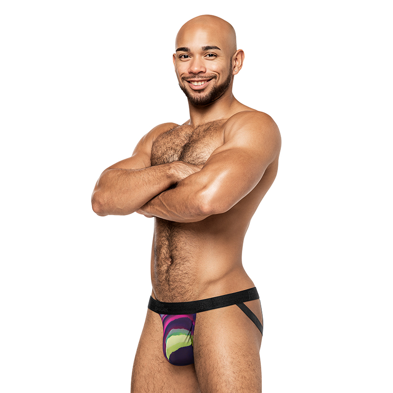 Galactic Print Strappy Jock L/XL from Male Power Lingerie. From the Galactic Collection by Male Power, the Strappy Ring Jock features plush elastic strapping attached to two metal rings in rear, a comfort contoured pouch front and an ultra plush tone on tone embossed waist band. Smooth sheer micro Mesh fabric with all way stretch, cosmic themed multi color print throughout. Materials fabric blend: 90% Nylon, 10% Spandex. Sizes large to extra large, L/XL. Waist 36 inches to 42 inches. Care instructions: hand wash separately, cold water, line dry. Do not bleach. Categories: Lingerie, Clothing, Men’s Underwear. Lingerie, Clothing, Naughty Role Play, Men’s Underwear, Men’s Fetish Wear. 2024.