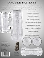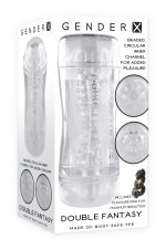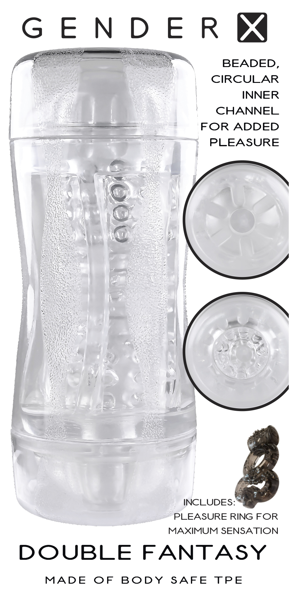 Gender X Double Fantasy Male Masturbation Device from Evolved Novelties. Allow the pleasure possibilities to unfold with this unique dual ended stroker that is beautifully transparent for an erotic see through experience for visual stimulation and viewing. Two separate entries with varying sizes: one tight, one loose, lets you choose your adventure inside the circular beaded chamber that is soft and squishy, yielding yet firm. An included vibrating ring lets you experiment with intense stimulation while you play! The hard plastic exterior canister is textured for an easy grip while caps at both ends ensure safe storage and protection. Sleeve pops out for cleaning. Features: double ended clear stroker: 2 entries for varied experience. Tight entry .5 inch diameter. Loose entry 1.15 inches diameter. Beaded, circular inner channel. Clear for erotic see through look. Textured canister for easy hand grip. Dual caps for storage, caps lock into place. Stroker sleeve removes for cleaning. Made from squishy soft Thermoplastic Elastomers TPE. Size canister made from durable ABS plastic. Size height 6.75 inches, depth: 2.72 inches, width 2.72 inches. Bulk weight over half a pound. Phthalate free and latex free. Waterproof for use in the bathtub, and submersible. Includes vibrating Cock Ring. Categories: Male Masturbators, Sex Toys for Men, Solo Masturbators, Fleshlight, Packers. 2023.