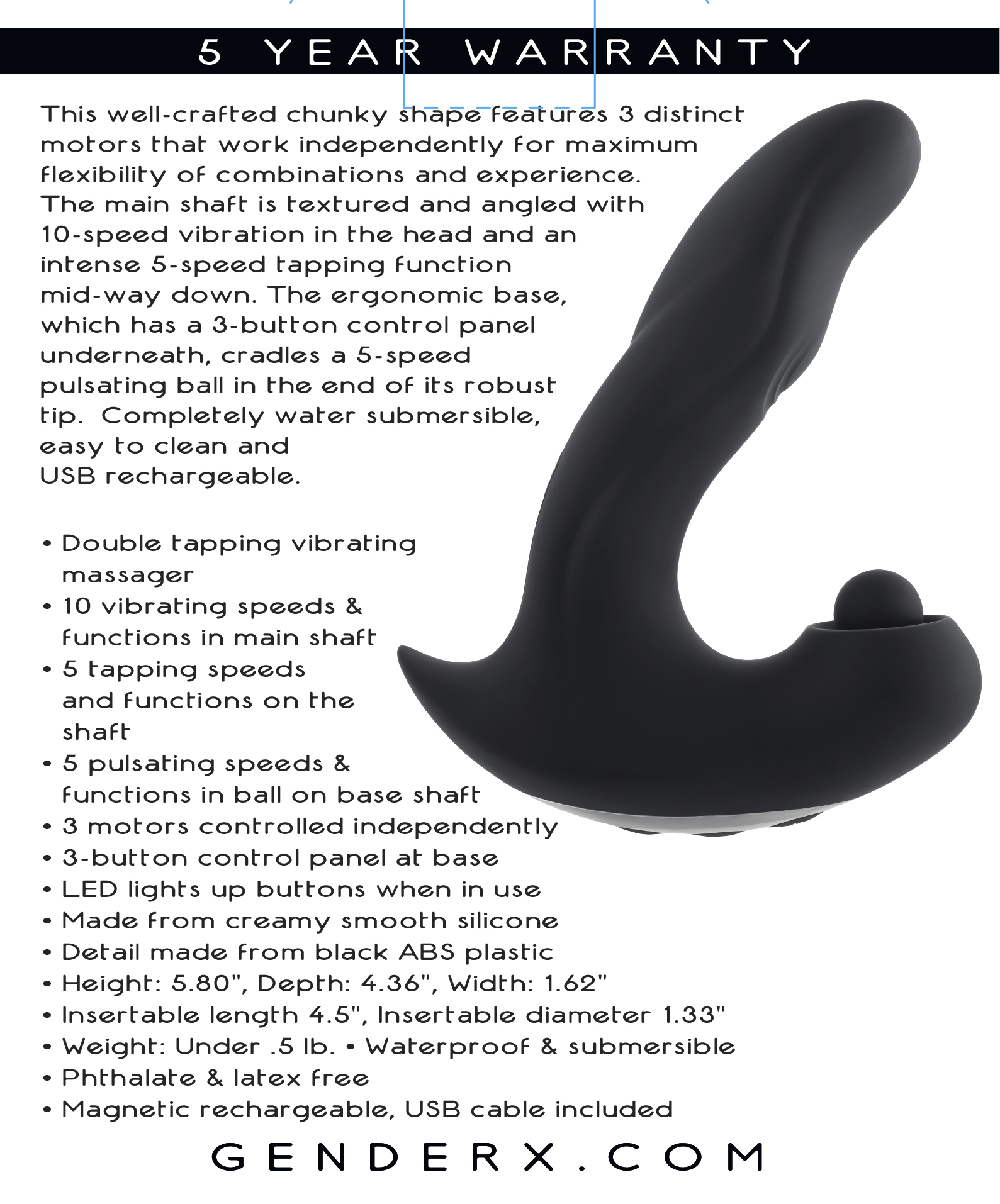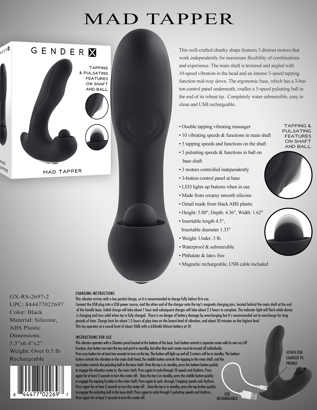 Gender X Mad Tapper Tapping and Pulsating features on Shaft and Ball Massager from Evolved Novelties. This well crafted chunky shape features 3 distinct motors that work independently for maximum flexibility of combinations and experience. The main shaft is textured and angled with 10 speed vibration in the head and an intense 5 speeds tapping function mid way down. The ergonomic base, which has a 3 button control panel underneath, cradles a 5 speeds pulsating ball in the end of its robust tip. Completely water submersible, easy to clean and USB rechargeable. Features: double tapping vibrating massager. 10 vibrating speeds and functions in main shaft. 5 tapping speeds and functions on the shaft. 5 pulsating speeds and functions in ball on base shaft.3 motors controlled independently. 3 button control panel at base. Light Emitting Diode LED lights up buttons when in use. Made from creamy smooth Silicone. Detail made from Black ABS Plastic. Size height 5.80 inches, depth 4.36 inches, width 1.62 inches. Insertion length 4.5 inches, insertion diameter 1.33 inches. Bulk weight under half a pound. Waterproof vibrations. Submersible for play outside the bedroom. Made with body safe materials both Phthalate free and latex free. Magnetic rechargeable, USB cable included. 5 years warranty. Categories: Anal Toys, Prostate Massagers, P-Spot Stimulators, Vibrators, Rechargeable Vibrators, G-Spot Massagers. 2023.