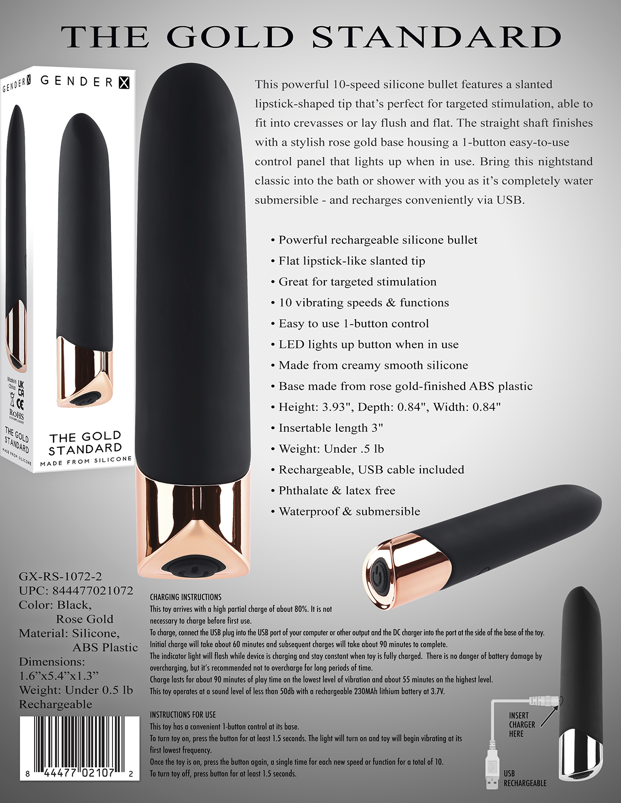 Gender X The Gold Standard from Evolved Novelties. This powerful 10 speed Silicone bullet features a slanted lipstick shaped tip that is perfect for targeted stimulation, able to fit into crevasses or lay flush and flat. The straight shaft finishes with a stylish rose gold base housing a 1 button easy to use control panel that lights up when in use. Bring this night stand classic into the bath or shower with you as it is completely water submersible and recharges conveniently via USB. Features: powerful rechargeable Silicone bullet. Flat lipstick like slanted tip. Great for targeted stimulation. 10 vibrating speeds and functions. Easy to use 1 button control. Light Emitting Diode LED lights up button when in use. Made from creamy smooth Silicone. Base made from rose gold finished ABS plastic. Size height 3.93 inches, depth 0.84 inch, width 0.84 inch. Insertable length 3 inches. Bulk weight under half a pound. Rechargeable, USB cable included.Phthalate free and latex free. Waterproof, submersible. Categories: Bullets, Eggs, Rechargeable Vibrators, Sex Toys for Women, Vibrating Bullets and Eggs. 2023.