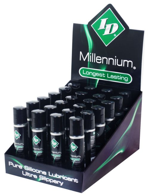 ID Millennium Silicone Long Lasting Personal Lubricant 24 pieces 1 fluid ounce bottles point of purchase display. ID Millennium Lubricant is the longest lasting! Long lasting and does not dry out! ID Millennium is here to provide you with the ultra long lasting lubrication that you have been looking for! Manufactured using high quality Silicone, ID Millennium Lubricant is sure to stay slippery for as long as you need it to, even underwater. Latex condom compatible and great for all over massage, too. Features: long lasting. Latex condom compatible. Does not dissolve in water. Enhances masturbation. Silicone based. ID Millennium Point of Purchase Display 1 ounce 24 pieces. Ingredients: Cyclopentasiloxane, Dimethicone and Dimethiconol. ID Millennium from Westridge Laboratories, Inc. Categories: Erotic Body Lotions, Lubricants, Silicone Based Lubricants, Health and Beauty Aids, Lotions. 2023.