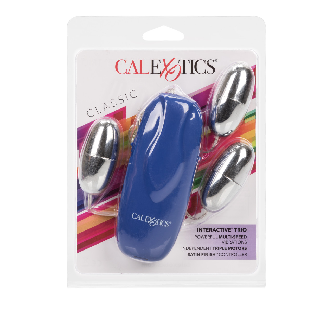Classic Interactive Trio Bullet Vibrators from California Exotic Novelties infinite possibilities for loving couples. Enjoy unlimited sensual possibilities with the versatile Interactives Trio Bullets. The trio of sleek, contoured, vibrating mini bullets is designed for tantalizing erotic play, with no limitations. Use the ultra powerful vibration sensations to arouse and stimulate internal and external super sensitive sweet spots and erogenous zones. The bullet vibrators are perfect for imaginative solo play, and ideal for erotic couples seduction. Each bullet vibrator measures a discreet 2.25 inches by 1 inch and is made from durable ABS Plastic, and boasts powerful multi-speed vibration action. The bullet vibrators are cord attached to a hand held ABS Plastic with Rubber Cote controller that has dual controls. Use the petite vibrating bullets for simultaneous direct internal or external arousal, or with your favorite toy. Simply pop a bullet into the toys flexible sleeve and enjoy endless pleasure. Use your imagination and explore your fantasies with the bullet vibrators. The stimulating vibrating teasers can be used to tantalize any area of the body, and can be activated together for maximum sensuous, ecstasy. Before and after use, clean the bullets with a toy cleaner spray. Interactive power pack with dual controls drives three ultra powerful bullets Why limit vibrating pleasure to only one pleasure zone when you can enjoy it on three? The Interactive Trio is a set of three powerful vibrating bullets connected to a single multiple-speed controller. A slider switch on the left of the controller allows the user to set the speed for a single attached bullet, while the other two vibrate simultaneously with the right switch setting. Whether used to intensify solo satisfaction or to add a whole new dimension to lovemaking, the infinite possibilities of these vibrating bullets make them three toys in one! Safe and pure for body and pleasure. Made using phthalate free, non-toxic materials ABS Plastic with Rubber Cote Polyurethane PU controller. ABS Plastic with Silver Plating Silver Bullets. ABS plastic with Rubber Cote Polyurethane PU Bullet Vibrators. Each bullet measures 2.25 inches long by 1 inch wide. Bulk weight 5.2 ounces. Vibrating sex toy requires 3 AA batteries, not included. Do not leave batteries in the vibrator between uses. A water based lubricant is recommended. 1 year warranty. Women, Bullet, Beads and Balls, Bullets. Interactive Trio Bullets is a registered trademark for California Exotic Novelties. Sex toys and sexual wellness. Categories: Bullets, Eggs, Sex Toys for Women, Men, Couples, Vibrating Bullets, Eggs, Dual Bullets and Eggs. 2023.