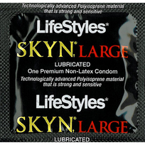 Lifestyles Skyn Large Condoms 3 Pack is the first premium condom made from polyisoprene, a scientifically formulated non-latex material that delivers the ultimate sensitivity that is the closest thing to wearing nothing. Polyisoprene material provides softer, more natural feel than latex. Clinically proven to enhance sensation. Combines the strength of premium latex with the sensitivity of an ultra thin condom for that Skyn-to-Skyn sensation. Ideal for people with latex allergies or latex sensitivity. Long-lasting, ultra smooth lubricant enhances the experience. A high quality alternative, Lifestyles Skyn are condoms that are made with a special polyisoprene material that transfers body heat well for more intimate sensations. Each lubricated condom is tested to ensure strength and durability, providing protection against STDs and pregnancy. Skyn condoms are completely latex free and a perfect choice for those with sensitivities, or a partner with allergies to latex. Type: Condoms Pack: 3 Special Features: Lubricated, Latex Free. Lifestyles Skyn Large Condoms 3 Pack.
