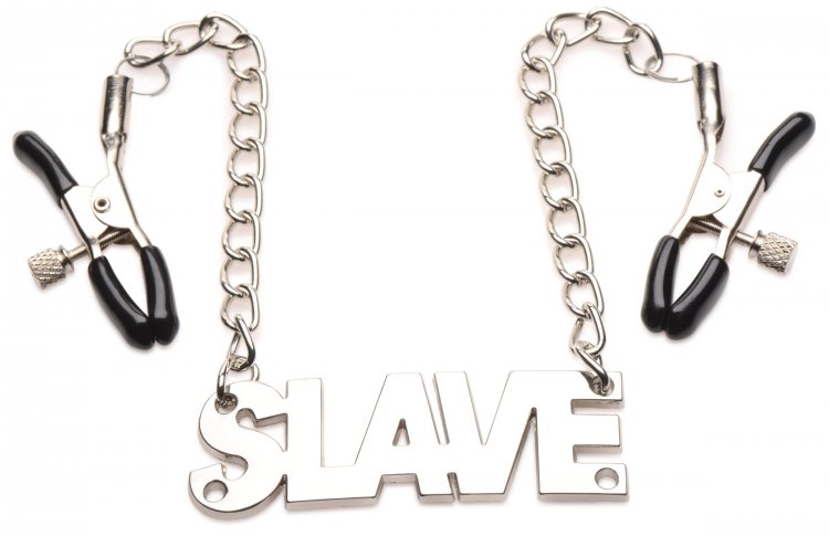 Master Series Enslaved Slave Chain Nipple Clamps from XR Brands. Make sure everyone knows their place when they wear these nipple clamps. The large, bold font spells out Slave and with a tug against the clamps you can put them in their place if they forget! The nickel free metal is perfect for sensitive skin and the shining metal looks great as a kinky accessory! Adjust for the perfect pressure with these clamps. Simply screw tight until they feel secure around the base of each nipple. The rubber tips keep the delicate skin safe from abrasions and scratches. Easy to clean, simply spray clean with a toy cleaner and wipe dry. Measurements: overall length 15.75 inches, Chains length 4 inches, Nipple Clamps open up to 0.5 inch wide. Total weight 1.5 ounces. Materials: Metal, Iron, Zinc alloy, PVC. Color Metal. Key features: adjustable pressure. The nipple clamps adjust to the pressure of your choosing by twisting the screw until tightened and secure.Rubber tips: Protect your sensitive skin from abrasive metal with the rubber tips that cover the ends of the clamps. A labelled Slave! The large lettered Slave sign is made from Nickel free metal and provides a fun addition to bedroom role playing! Categories: Bondage, Fetish, Kink, Sex Toys for Couples, Nipple Play, Bondage Kits, Kinky Sets. 2023.