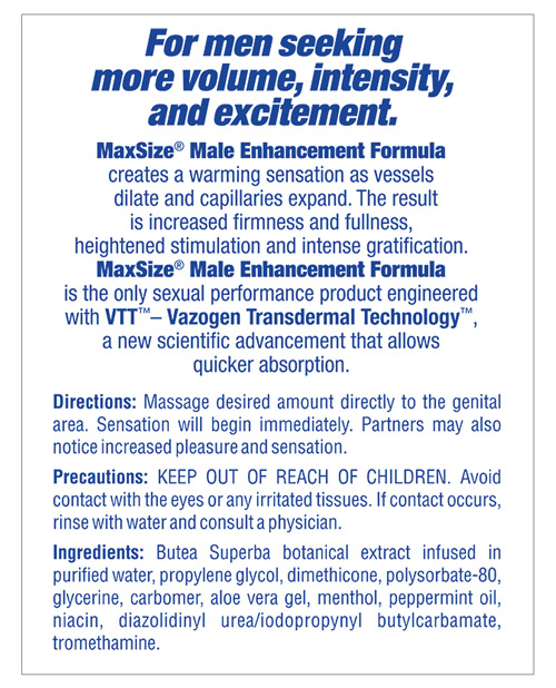 Max Size Cream Pack from M.D. Science. A great complement to Max Size tablets, Max Size Cream is the only topical erectile enhancement that delivers immediate results. Max Size Cream is a male enhancement topical formula that provides a unique transdermal delivery system for quick absorption and immediate results. Max Size Cream is the only topical male enhancement product with Butea Superba, a well documented and patented natural PDE-5 inhibitor which helps essentially lock in the enzyme responsible for enhancing erectile response. This natural herb is only now coming to the U.S. after years of research in Thailand. Max Size Cream is a natural male enhancement product that will significantly dilate blood vessels and capillaries. In clinical trials, users report increased sexual stamina and male enhancement without any side effects. Users convey a distinct sensation of pleasure and enhancement within moments of application. Max Size Cream is formulated in a lubricating Vazogen Transdermal Gel, is not oily or greasy and may be enjoyed during sex by both partners, male and female. Max Size Cream may be used by those who have medical conditions that prevent them from using ingestible. Max Size Cream provides optimal male enhancement when used regularly over time and especially when used in conjunction with Max Size oral digestible formula. Applied generously Max Size Cream engorges the penis giving men a firm long lasting erection. With a cooling, heated tingly sensation your partner will love it too. Lightly flavored with Mint making it edible. Ingredients: Butea Superba Botanical Extract infused in Purified Water, Propylene Glycol, Dimethicone, Polysorbate 80, Glycerin, Carbomer, Aloe Vera Gel, Menthol, Peppermint Oil, Niacin, Diazolidinyl Urea/Iodopropynyl Butlcarbamate, Tromethamine. Sample size for travel. Categories: Erotic Body Lotions, Lubricants, Warming, Tingly Lubricants, Creams. 2023.