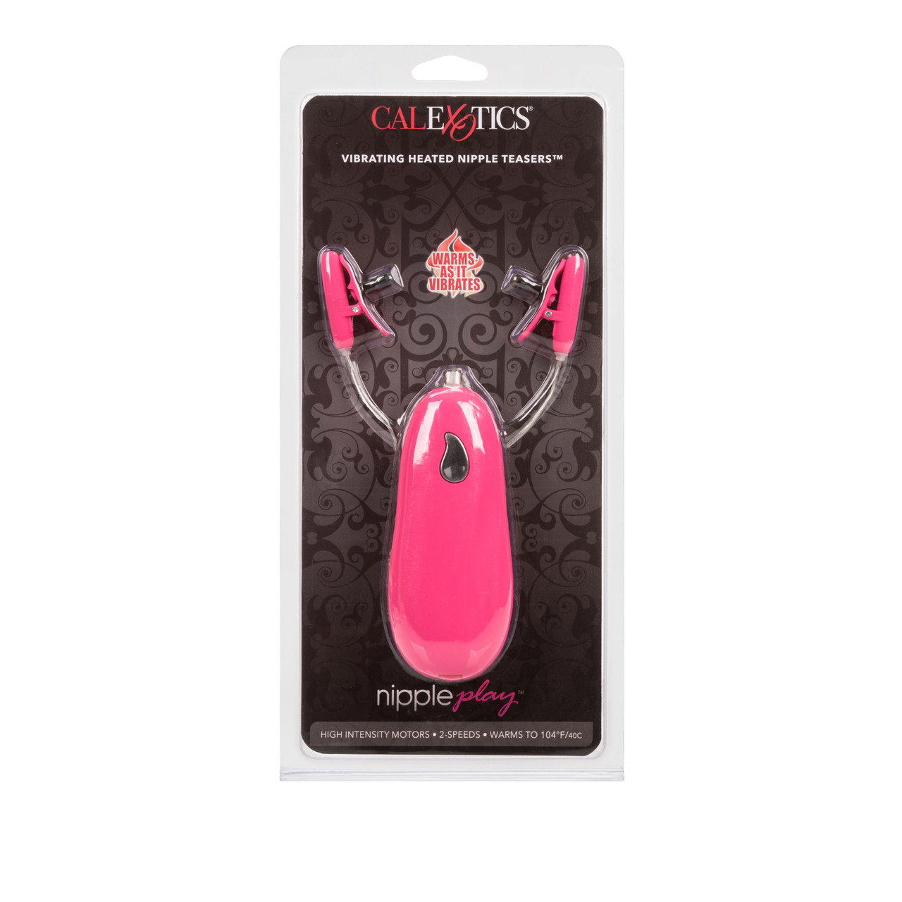 Nipple Play Vibrating Heated Nipple Teasers Pink from California Exotic Novelties. Experience intensely erotic tingles with the Nipple Play Vibrating Heated Nipple Teasers. The easy to use teasers are designed for super sensitive extended nipple play, and are ideal for first time and experienced users. Power up the fun with 2 AA batteries, and turn on the stimulating and tantalizing heated vibrating enjoyment. The petite and discreet non-piercing clamps measure 1.5 inches by 1 inch and are made from ABS Plastic with a Polyurethane PU Cote. The easy twist nylon screws offer speedy adjustment for the perfect fit. When activated, via the ABS Plastic controller, the nipple teasers warm up as they vibrate. Lovers of nipple play fun will be in pleasure heaven. The controllers high intensity motor and 2 speed action ensures incredibly pleasurable nipple satisfaction. To use, simply attach the clamps directly onto the nipples to experience ultimate warming and vibrating ecstasy. The teasers can also be used on other sensitive areas of the body. Non-piercing, petite, adjustable nipple clamps that warm as they vibrate. Fully adjustable multi-use clamps. High intensity motor with 2 speed push button control. Warms to an incredible 104 degrees Fahrenheit or 40 degrees Celsius. Silky smooth Satin Finish. Safe and pure for body and pleasure made using phthalate free materials ABS plastic with polyurethane PU Cote controller, clamps, Nylon screws, ABS Plastic with silver plating button, PVC cord. Vibrating nipple clamps require 2 AA batteries, not included. Bulk weight 1.8 ounces. 1.5 inches by 1 inch. Categories: Bondage, Fetish, Kink, Vibrators, Nipple Play, Bondage Kits, Kinky Sets, Heats. 2023.