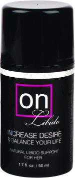 ON LIBIDO is formulated to support a womans healthy sexual response and desire. It naturally corrects imbalances that may be robbing a woman of her desire for sexual intimacy. In other words, it helps women get their mojo back! With daily use, most women feel an increase in their interest and desire for sexual activity within the first couple of weeks. Some women feel more energetic, mentally focused, and have a greater sense of well-being. Apply 1-2 full pumps manually to a part of the body with little to no hair (such as the hips, thighs, stomach, or arm). It is not applied directly to the vagina. Always encourage people to try using the product daily for at least one full month. Increases sexual desire and arousal naturally, increases blood flow to the vaginal area, makes her more sensitive to stimulation, helps balance her hormones, helps boost energy and elevate mood, made with natural ingredients, the airless pump is hygienic and preserves the formulas potency, it is not a personal lubricant, Glycerin and Paraben free, no artificial dyes, perfumes, or harsh preservatives. Natural Libido support for her. 1.7 fluid ounces. Ingredients: Water, Coco-Caprylate/Caprate, Cetearyl Alcohol, Cetearyl Glucoside, Stearyl Alcohol, Propanediol, Phospholipids, Dehydroepiandrosterone (DHEA), Tribulus Terrestris, Saw Palmetto Berries, Mucuna Pruriens, Epimedium Sagittatum, Maca, Muria Puama, Safflower Seed Oil, Evening Primrose Oil, Lecithin, Gluconolactone, Sodium Benzoate, Potassium Sorbate, Honeysuckle, Red Beet Extract, Annatto Extract, Dimethicone, Rosemary Extract Oil, Lavender. On Libido for Her from Sensuva. Categories: Erotic Body Lotions, Meds and Supplements, Gels, Xmas items. Restricted, Amazon Restricted. 2024.