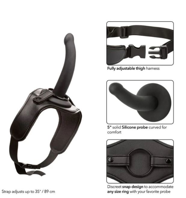 Step up your game in harness play with these minimal thigh harness strap-ons. The fully adjustable harness can allow either partner to slip in and enjoy the giver sensations they desire. An ideal beginner role-playing sex toy, this Onyxxx 5 Silicone Probe Black Thigh Strap-On Harness Set is sure to be the highlight of your bedroom duties.Special Features: Thigh strap strap-on harness 5 solid silicone curved probe 2 interchangeable O-rings Discreet snap-close design Fits thigh sizes up to 35 Suction cup based probe Unisex strap-on set Phthalates free 100% Waterproof (probe) Travel-friendly Comfortable and durable