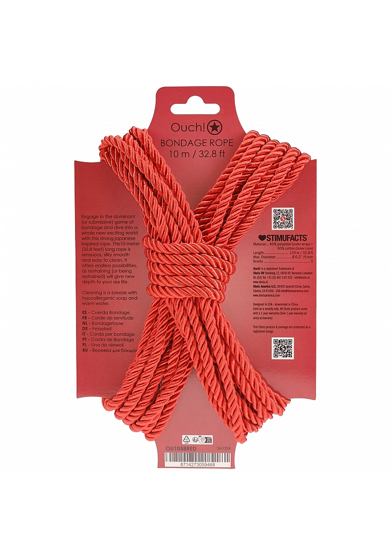 Engage in the dominant (or submissive) game of bondage and dive into a whole new exciting world with this strong Japanese inspired rope. This10-meter (32.8 feet) long rope is sensuous, silky smooth and easy to clean. It offers endless possibilities, as restraining (or being restrained) will give new depth to your sex life. Cleaning is a breeze with hypoallergenic soap and warm water.