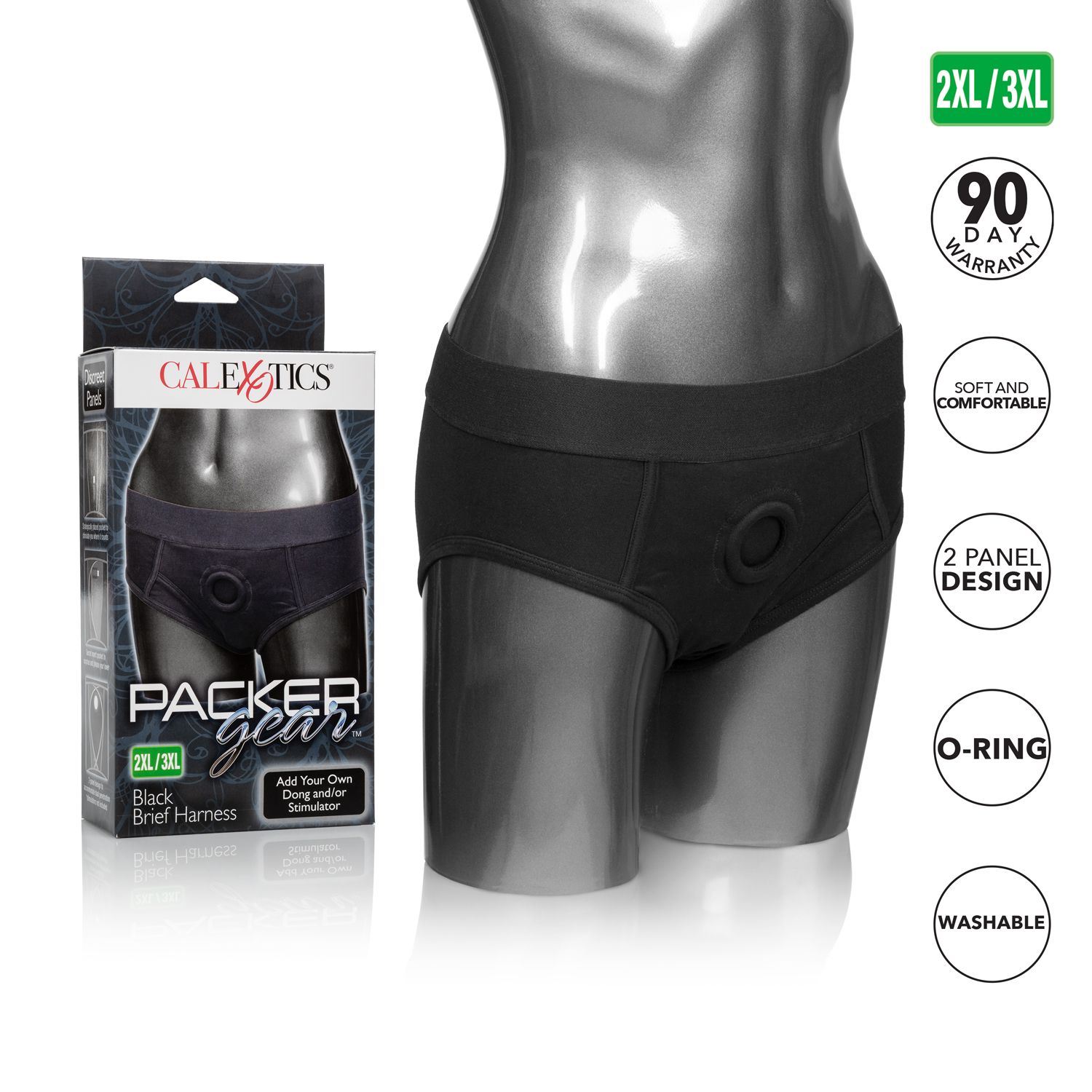Packer Gear Black Brief Harness 2XL/3XL from California Exotic Novelties. The soft and comfortable Packer Gear Black Brief Harness is designed for easy wear and ultimate penetration satisfaction. The hipster cut panty has a fashionable masculine style and internal pockets to store your favorite vibrating stimulator. For one on one erotic action, slip on the Briefs and insert a power packed Dong. The washable Packer Gear Black Brief Harness is made from soft, stretchy and comfortable Cotton, Spandex and has an extra wide waistband for full support. The ultra soft lining features internal pockets and an internal strap that secures your Packer firmly in place. The reinforced 2 panel design also has a stretchy O-Ring that easily accommodates most sizes of tantalizing packers, dongs or probes. For your comfort and pleasure, these discreet Brief Harness offer exceptional support of any other toys during stimulation. The comfort fit Packer Gear Black Brief Harness has no adjustable straps or buckles. The easy wear Briefs slip on like underwear and fit like a glove. To experience orgasmic partner penetration pleasure all you have to do is select your favorite pleasuring tool. Insert a bullet shaped vibrating stimulator into the internal pocket and enjoy double the ecstasy. Discreet 2 panel design to accommodate dual penetration. Reinforced O-ring stretches to accommodate most Packers, Dongs or Probes. Soft, stretchy and comfortable. Comfortable soft lining. Internal strap to secure your packer in place. Packer not included. Internal pockets to add a favorite stimulator, not included. Washable. 95% Cotton, 5% Spandex. Bulk Weight: 4.4 ounces. Categories: Packer Gear, Bondage, Fetish, Kink, Women’s Underwear, Naughty Role Play, Strap-Ons, Harnesses, Sex Toys for Couples, Women, Body Harnesses, Lingerie, Clothing. 2023.