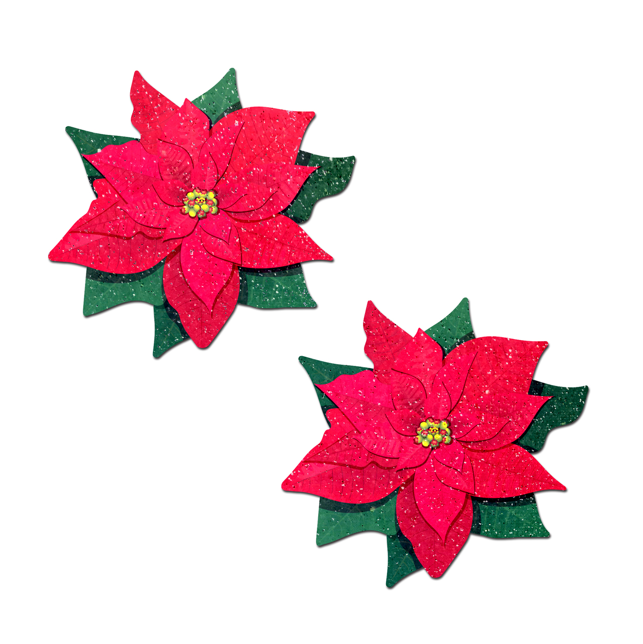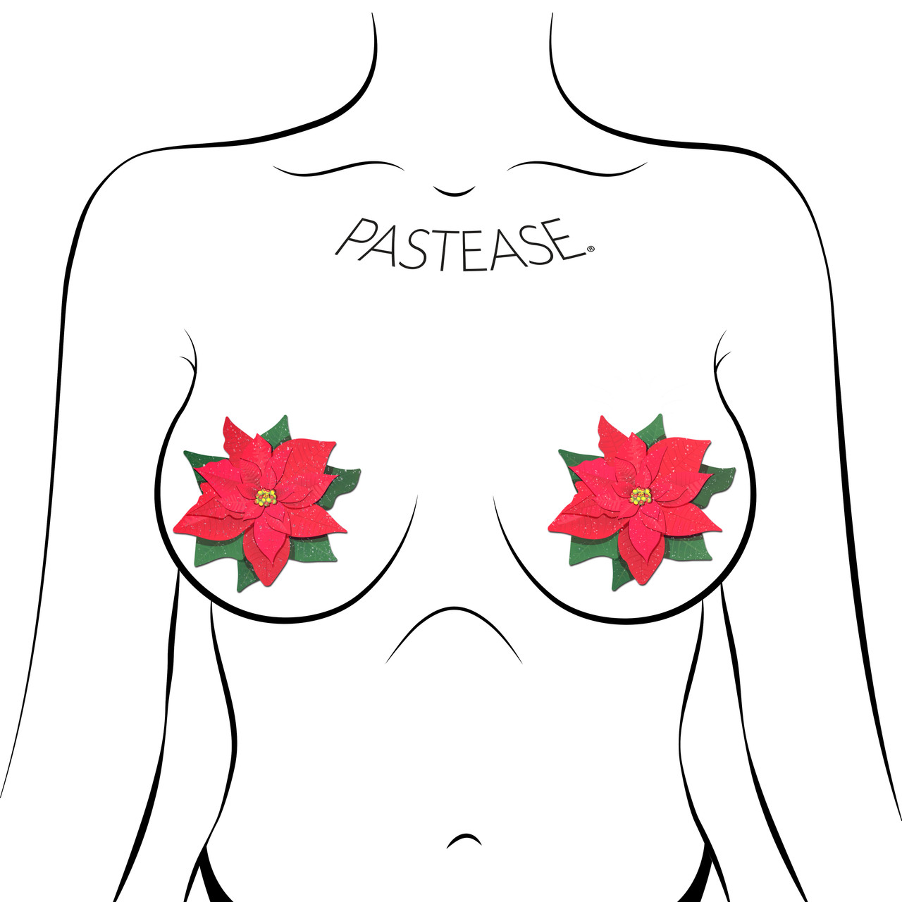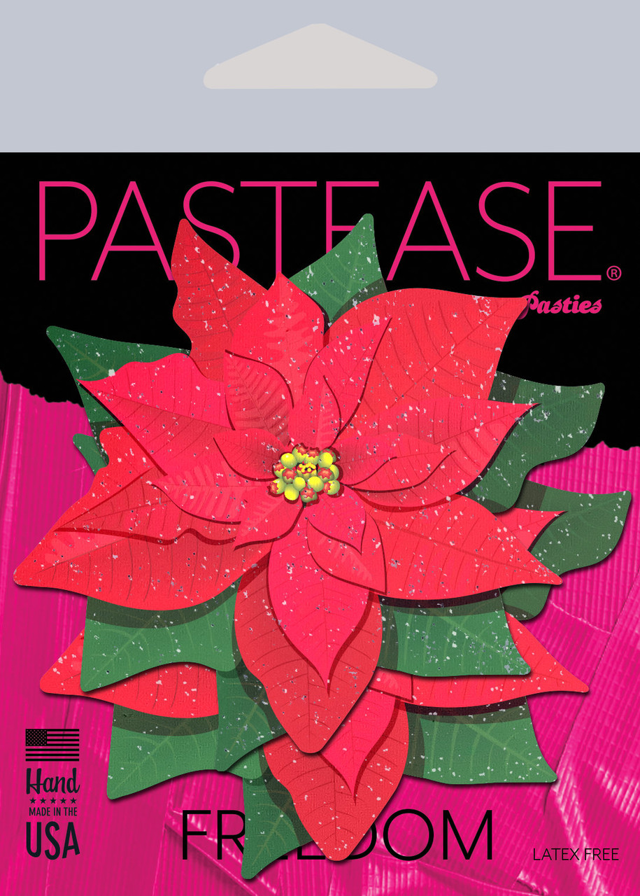 Pastease Winter Poinsettia Red and Green Pasties. Christmas Winter Poinsettia Red and Green Nipple Pasties by Pastease are hand made in the USA of soft form fitting glitter velvet material that forms seamlessly to curves and resists wrinkling over hardening nipples. Just peel and stick these winter Poinsettia pasties on clean, dry skin! All Pastease pasties feature latex free, medical grade, waterproof adhesive that stays securely in place for as long as you like and until they are gently removed. Conceal or reveal with Pastease nipple pasties when worn with a sexy outfit, daring bikini, sheer top, revealing dress, Hefty bag, body lotion, crazy costume, party theme or nothing at all! Dimensions 3.5 inches by 3.3 inches. Coverage: 2.2 inches. Pastease are the fun maker that brings out your inner Tease! All Pastease products are hand made, so the finished product you receive may vary slightly from the posted image. Go get your sexy fun freedom on! XOXO Pastease! Categories: Lingerie, Clothing, Sexy Costume Accessories, Pasties and Accessories. Restricted, Amazon Restricted. Primary image package. 2024.