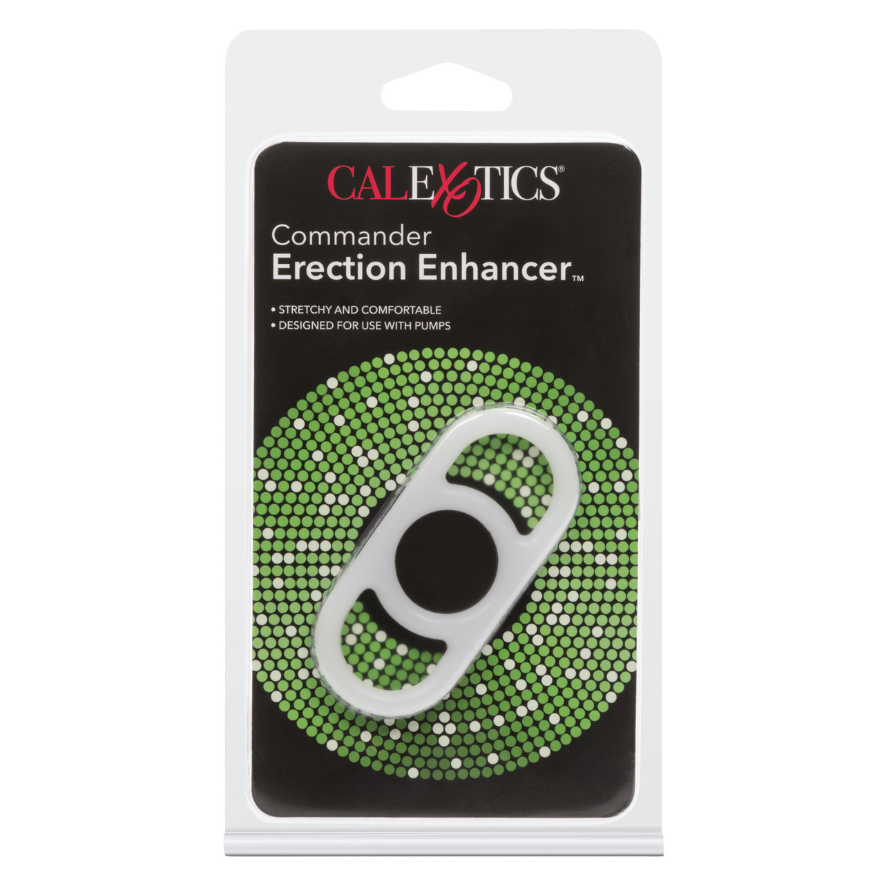 Penis Pump Commander Erection Enhancer from California Exotic Novelties. Super size your intimate pleasure, and erotic performance, with the Penis Pump Commander Erection Enhancer. The stretchy Erection Enhancer is designed for solo use or use with an Erection Pump, for prolonged intimacy and a heightened climax experience. Pump it up, and then maintain your erection with the dual handled Ring. The easy to use Erection Enhancer is made from unscented, superior, Silicone and has a unique double handled design for secure positioning. To use the enhancer ring, stretch the Ring over the Erection Penis Pump opening so that it rests on the flexible donut seal. Once you have achieved the desired Pumped effect, slide the Erection Enhancer off the Pump, and directly onto the erect Penis. Glide down to the base and allow the Ring to maintain stamina support for your elevated performance. Ideal for first time and experienced Pump users, the erection enhancer maintains a rock hard erection for prolonged periods of tantalizing orgasmic play. Take full control of your sensual experience and use the stretchy Ring to explore secret fantasies and exotic pleasure. To maximize the sensitivity and sensations, always use a quality water based personal lubricant with this sex toy. Clean the Enhancer before and after every use. Wash the Ring in soapy water, or clean with a toy cleaner spray. Stretchy 2 handled Erection Ring, designed specifically for use with any Penis Pump. Fits securely on the base of the Pump and easily slips over the penis when erect. Safe and pure for body and pleasure. Made using phthalate free, non-toxic materials Silicone. Stretches to 2.5 inches. Erection Enhancer measures 3.1 inches long by 1.5 inches wide. Bulk weight: 0.3 ounce. Pursuant to 18 U.S.C. 2257, Penis Pump Commander Erection Enhancer was produced on April 11, 2000, and the records required to be kept by that law are available at 14235 Ramona Avenue, Chino, California 91710. Custodian of Records: Susan Colvin. Penis Pump Commander Erection Enhancer is a registered trademark for California Exotic Novelties. Sex toys and sexual wellness. Categories: Sex Toys for Men, Cock Rings, Penis Pump Accessories, Male Pump Accessories, Men’s Cock and Ball Gear. 2023.