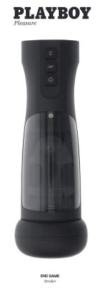 Playboy Pleasure End Game Stroker from Evolved Novelties. Freedom to Play: enjoy the journey and the End Game with this powerful Stroker designed for exquisite long lasting pleasure. Experience a whole new realm of sensations thanks to the supple, textured inner Sleeve that Strokes, Vibrates and Warms up to a delicious 100+F degrees. With an elegant design and easy to use UV stand for sanitizing post cleaning, you can be sure you are always ready for your next adventure. Panel details: Play with me key feature: Warming Stroker with Ultra Violet stand for sanitizing. Vibration: 7 vibrating speeds and rhythms, 8 stroking speeds and rhythms. Material: body safe Thermoplastic Elastomers TPE, ABS Plastic and Silicone. Both Phthalate free and Latex free. Waterproof Stroker. Size specifications: height 11.75 inches, depth 3.18 inches, width 3.9 inches. Insertable length 5 inches, diameter 1.0 inches stretches for most men. Please note both the heating element and stroker are rechargeable. One USB cord included. 5 years warranty. Categories: Male Masturbators, Vibrators, Sex Toys for Men, Rechargeable Vibrators, Solo Masturbators, Warming Masturbators, Masturbation Sleeves. 2023.
