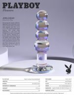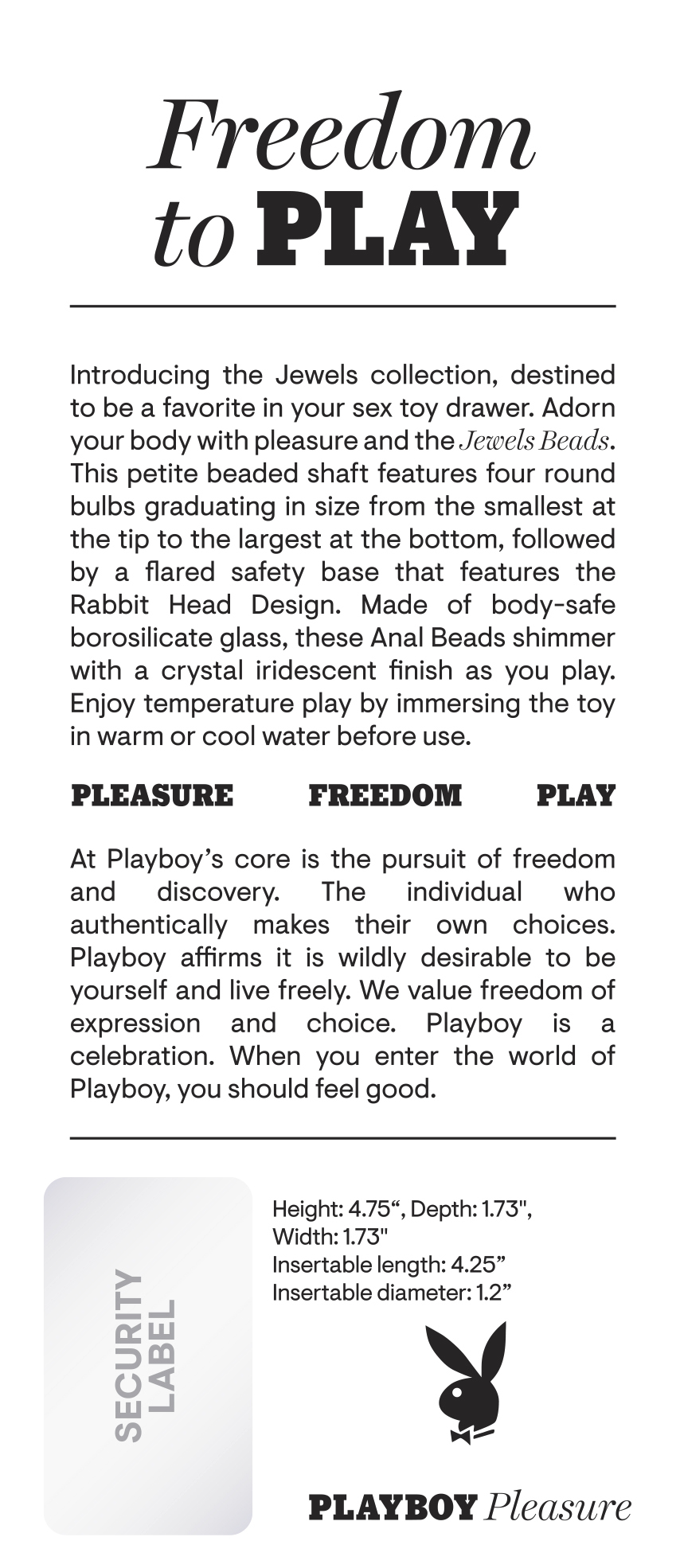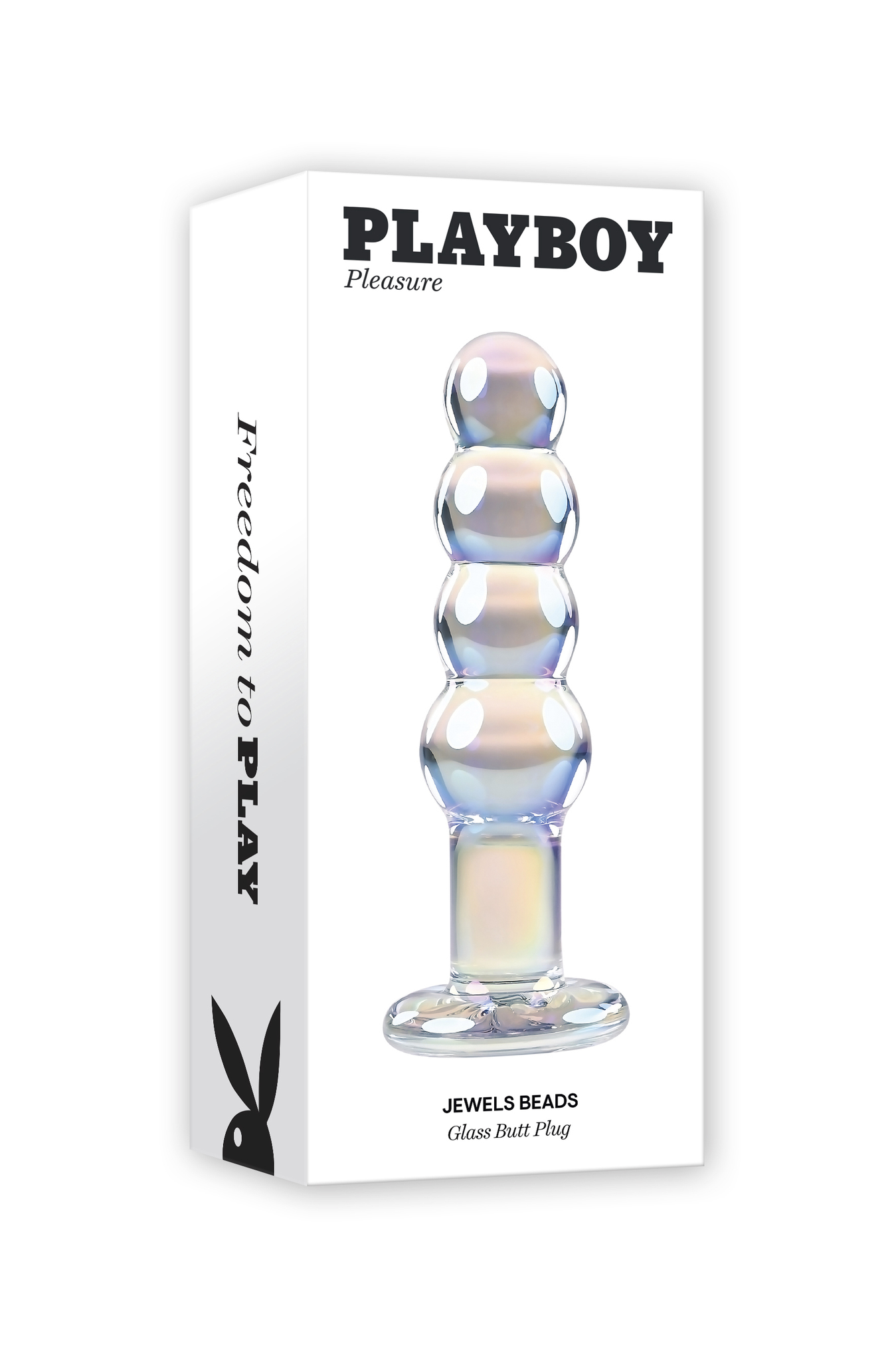 Playboy Jewel Beads Glass Butt Plug from Evolved Novelties. Freedom to Play: introducing the Jewels collection, destined to be a favorite in your sex toy drawer. Adorn your body with pleasure and the Jewels Beads. This petite beaded shaft features four round bulbs graduating in size from the smallest at the tip to the largest at the bottom, followed by a flared safety base that features the Rabbit Head Design. Made of body safe Borosilicate Glass, these Anal Beads shimmer with a crystal iridescent finish as you play. Enjoy temperature play by immersing the toy in warm or cool water before use. Panel details: Play with me key feature shatter resistant Glass, beaded shaft. Non-vibrating. Material: Borosilicate Glass. Waterproof, submersible. 5 years warranty. Size specifications: height 4.75 inches, depth 1.73 inches, width 1.73 inches. Insertable length 4.25 inches, diameter 1.20 inches. Categories: Anal Toys, Small, Medium Butt Plugs, Probes, Sticks, Rods, Anal Beads. 2024.